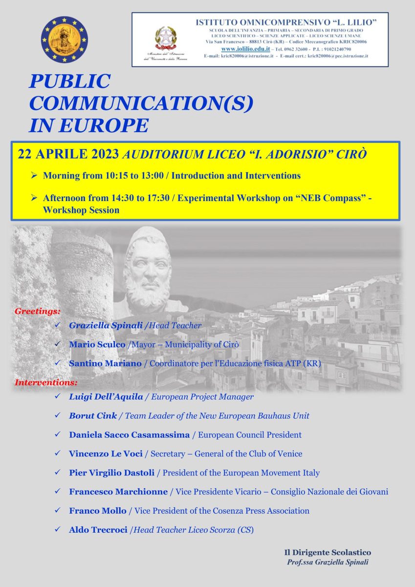Gli studenti delle classi terze hanno preso parte attivamente all’evento “Public Communication(s) in Europe”, seguendo la conferenza in aula magna nella mattinata e partecipando al workshop nel pomeriggio. Al Convegno erano presenti, oltre alla Dirigente Scolastica Graziella Spinali e al sindaco di Cirò Mario Sculco, eminenti rappresentanti delle organizzazioni europee e internazionali che hanno promosso la manifestazione, oltre al docente Franco Mollo e al Dirigente Scolastico Aldo Trecroci del Liceo scientifico Scorza di Cosenza collegati con una rappresentanza degli studenti.