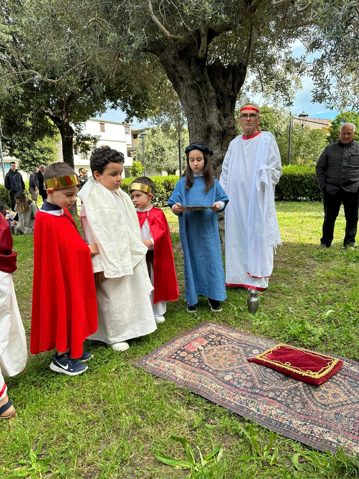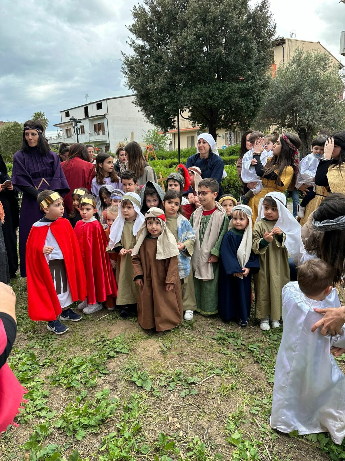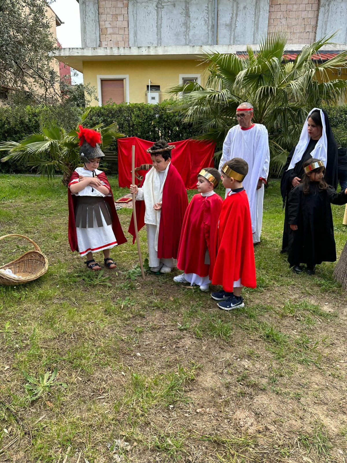 La rappresentazione è stata resa possibile grazie al grande impegno dei bambini che hanno cercato a loro modo di capire il mistero della Passione di Cristo,è stato spiegato in maniera semplice ai bambini dice la Dirigente la sofferenza di un uomo buono che si è sacrificato per gli uomini. I bambini spiega la Dirigente comprendono molto di più di quanto noi pensiamo, e abbiamo risposto in maniera molto semplice alle domande dando sostegno a quella che è la fede. La rappresentazione si è svolta anche grazie all’impegno delle meravigliose maestre che hanno fatto un lavoro eccezionale, alle mamme che hanno dato la loro disponibilità e alla Dirigente che è sempre ricca di nuove iniziative.