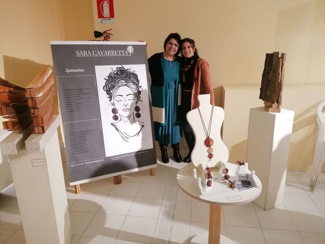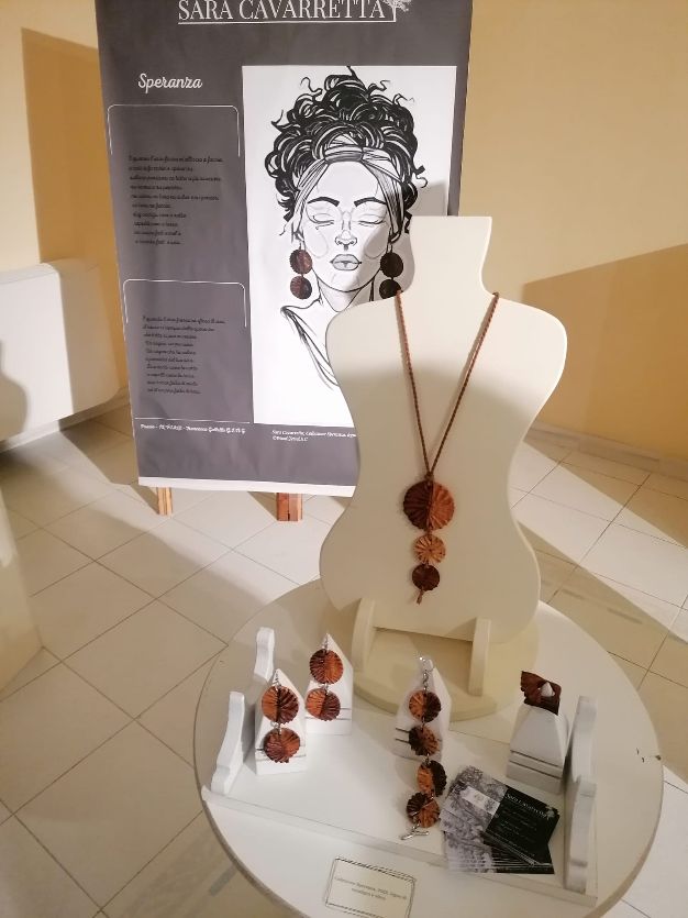 Le opere che ho esposto sono prettamente legate al mondo femminile. Infatti, per l’occasione, ho realizzato: Speranza, una collezione di gioielli – fantasia (composta da collana, orecchini, anello e bracciale Conchiglia) che riporta alla “Nascita di Venere” del Botticelli, da qui la forma della conchiglia, realizzata con legno di eucalipto e olivo. Impegnandomi nella ricerca di determinati equilibri cromatici e una particolare percezione olfattiva e tattile, ho così modellato la materia usando le varie tecniche: Intaglio; Traforatura o Sagomatura; Sgrossatura; Rifinitura; Lucidatura. Una collezione ispirata dalla poesia “Speranza” di Francesca Gallello. Cercando di veicolare tra il bellissimo messaggio della poesia e l’arte del creare ho deciso di presentare in mostra anche un banner con la poesia Speranza, affiancata da un’illustrazione digitale di Donna in stile Afro che indossa gli orecchini conchiglia.