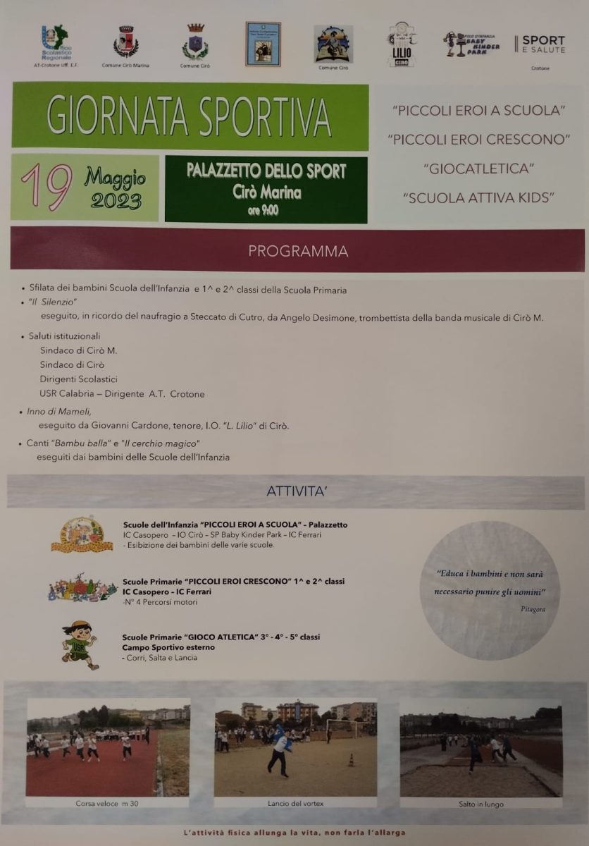 L’attività motoria e lo sport più in generale, saranno al centro di una ricca mattinata nel palazzetto dello sport di CiròMarina, dove è stata programmata la manifestazione promossa dal Miur , “Piccoli eroi a scuola”, “Piccoli eri crescono”, “Giocatletica”, Scuola Attiva Kids”, che si svolgerà venerdì 19 a partire dalle ore 09,00. Alla manifestazione parteciperanno le scuole del primo e secondo Istituto Comprensivo di Cirò Marina, Casopero e Filottete, l’Istituto Omniacomprensivo di Cirò e la scuola paritaria Baby Kinder Park-Family Center. Una manifestazione che si realizza a conclusione del programma motorio promosso dal Miur in collaborazione con l’Ufficio Scolastico Regionale per la Calabria, l’USP di Crotone con l’organizzazione dell’Ufficio di E.F. di Crotone con il prof. Santo Mariano e tutto il supporto delle amministrazioni dei Comuni di Cirò Marina e Cirò.