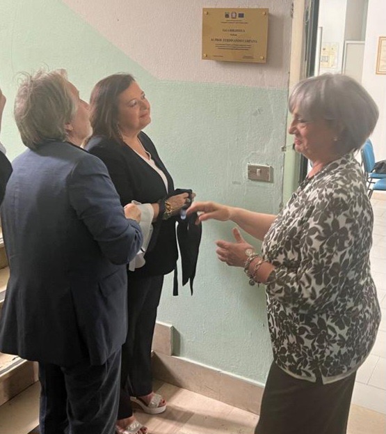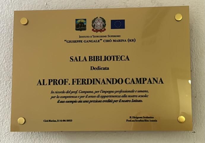 A suggello della cerimonia, il dono alla famiglia da parte della Dirigente e di tutta la comunità scolastica: l’intitolazione della Sala Biblioteca al prof. Ferdinando Campana. Don Pasquale Aceto, docente dell’Istituto Gangale, ha benedetto la targa e la Sala Biblioteca Campana, quale luogo emblematico di incontro, di pace e ricchezza culturale, affinché la memoria del prof. Campana possa rendere ancor più fecondo il senso della scuola e del suo compito.