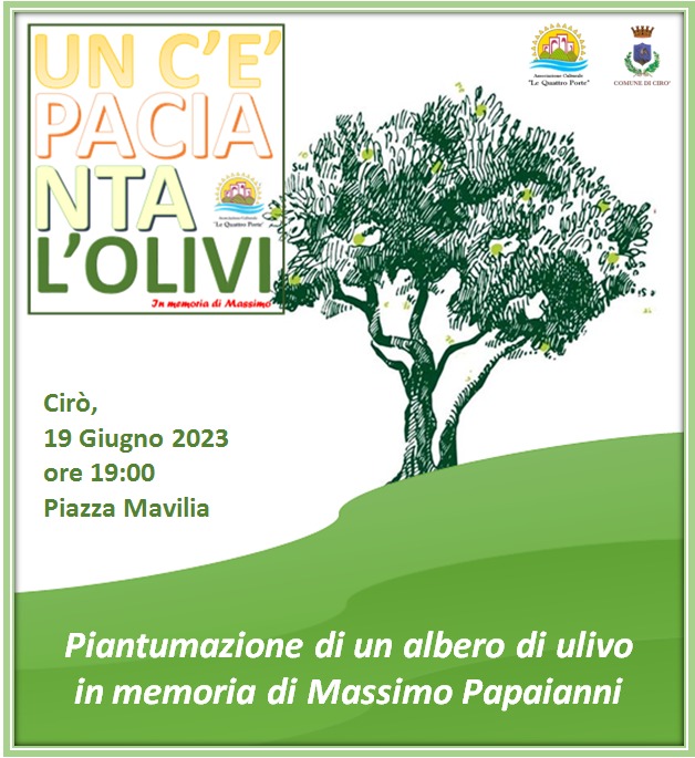 L’associazione culturale “Le Quattro porte” per ricordare la figura del socio Massimo Papaianni scomparso prematuramente a soli 43 anni dieci anni fa, oggi 19 giugno alle ore 20.00 sulla splendida terrazza di Piazza Mavilia, terrà la messa a dimora di una pianta d’ulivo in suo ricordo– scrive il presidente Gianluigi Murgi e il socio Cataldo Scarola:” del nostro caro amico e socio Massimo Papaianni, mai dimenticato”. La celebrazione si aprirà con la benedizione dell’ulivo da parte del Parroco Don Matteo Giacobbe. Presenti per l’occasione il Sindaco Mario Sculco e la famiglia Papaianni accompagnati dai cari amici di Massimo. “Un gesto per noi dal significato profondo capace di onorare la memoria di chi abbiamo perso”- conclude la nota dell’associazione “Le Quattro Porte”. Ogni anno in occasione della manifestazione che si tiene a Pasquetta :”Un c’è pacia nta l’olivi” da parte dell’associazione, gli organizzatori hanno sempre dedicato questa manifestazione al caro socio Massimo Papaianni, un grande pilatro delle attività sociali cirotane. Non c’era manifestazione a cui non partecipava, era l’anima che teneva unita qualsiasi attività dalla costruzione dei carri di Carnevale assieme agli artisti Francesco Florielli e Gianni Arcovio, alla costruzione delle scenografie teatrali, alla realizzazione della passione di Pasqua, alla pulizia del castello negli anni 90 insieme ai lavoratori LPU ed LSU, fino a tutte le grandi manifestazioni che ogni anno l’associazione “Le Quattro porte” organizzano per il sociale.