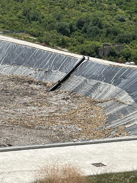 Conclusioni: La foto allegata evidenzia il livello raggiunto dal percolato nella discarica al 22/06/2023, con il cambio di colore del telo che indica un battente di altezza non inferiore a un metro, conformemente al D.Lgs. 36/2003. È fondamentale comprendere le ragioni alla base dello sversamento incontrollato del percolato nonostante la presenza dell’impianto di trattamento proposto. Solo attraverso un’indagine approfondita e l’attuazione di misure correttive adeguate sarà possibile affrontare questa problematica e mitigare le conseguenze ambientali negative.