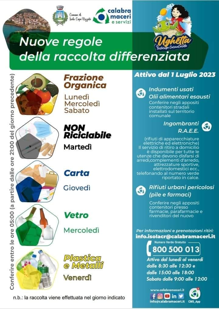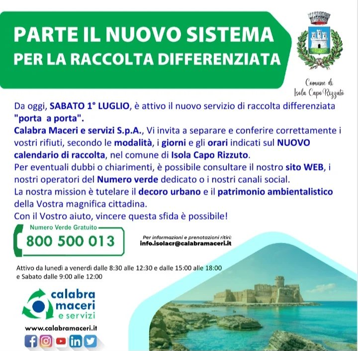 Da Sabato 1° luglio, Calabra Maceri e Servizi S.p.A., prende ufficialmente in carico il servizio di raccolta differenziata nel comune di Isola di Capo Rizzuto (KR).