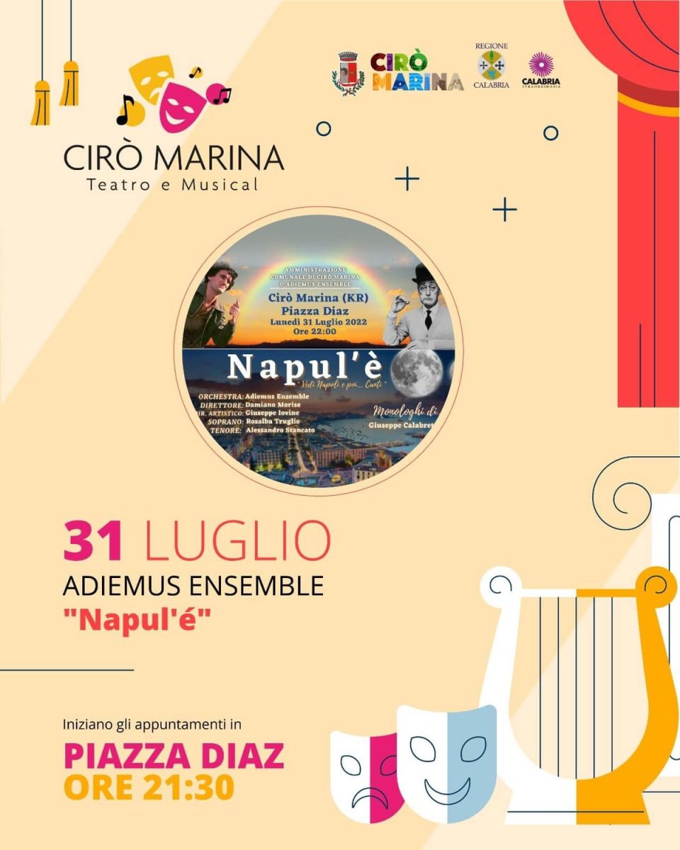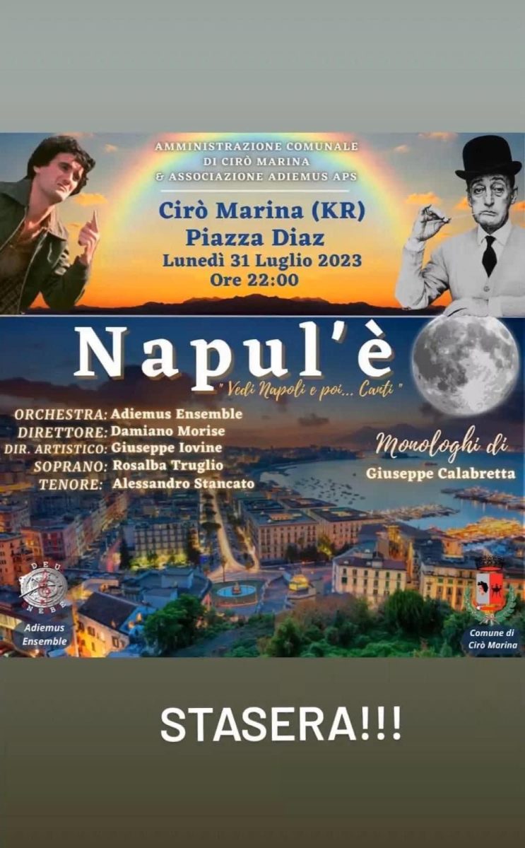 Stasera, lunedì 31 luglio, il palcoscenico si anima con l’entusiasmante performance di ADIEMUS ENSEMBLE che presenta: “NAPUL’É” Un coinvolgente concerto/spettacolo dedicato alle più belle canzoni napoletane, accompagnate da un’orchestra dal vivo, voci soliste e appassionanti monologhi.