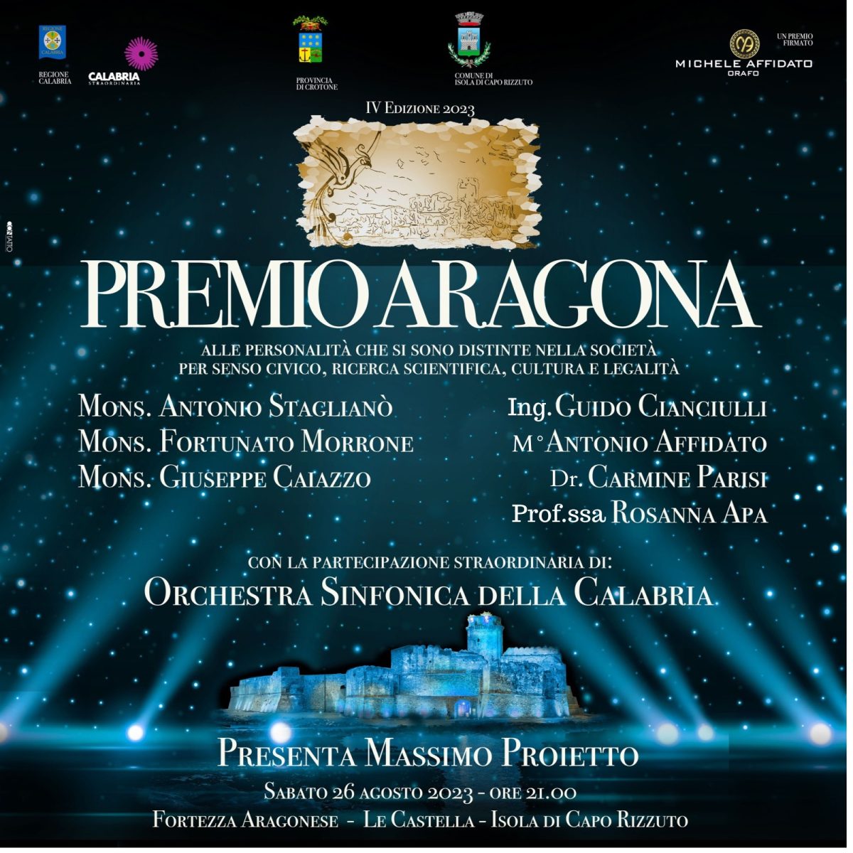 A fare da scenografia naturale al Premio sarà la Fortezza Aragonese di Le Castella, dove l’Assessore alla Cultura Antonella Pagliuso, delegata dal Sindaco alla programmazione dell’evento, ha dato appuntamento ad eccellenze del mondo della medicina, della cultura, del civismo che rappresentano il territorio di Isola e del Crotonese a livello nazionale ed internazionale.