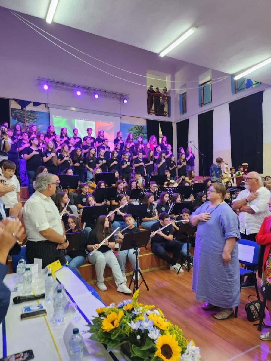 L’auditorium dell’Istituto ha poi visto l’orchestra e il coro, composti dagli alunni della Scuola Secondaria di I grado, eseguire l’Inno italiano e l’Inno europeo. Le note musicali hanno risuonato nell’aria, unendo cuori e menti in un inno all’Europa e alla sua ricca diversità culturale.