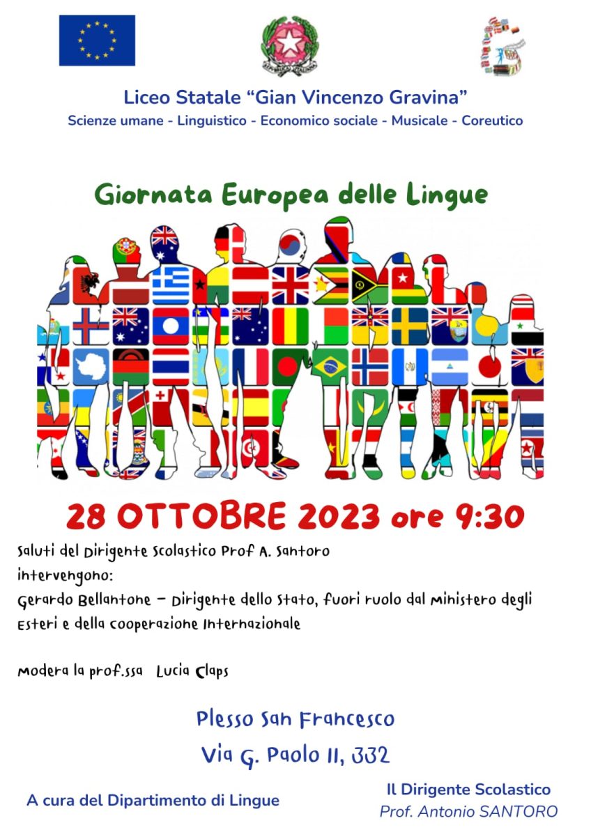 Il Dipartimento di lingue del liceo G.V. Gravina ha celebrato la giornata Europea delle lingue, un evento che è stato posticipato a causa dell’allerta meteo emanata il 26 Settembre, giornata ufficiale per celebrare le lingue.