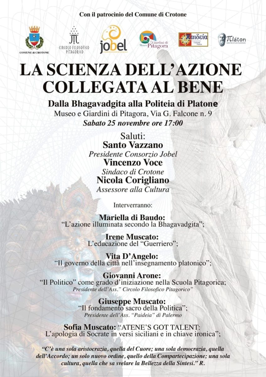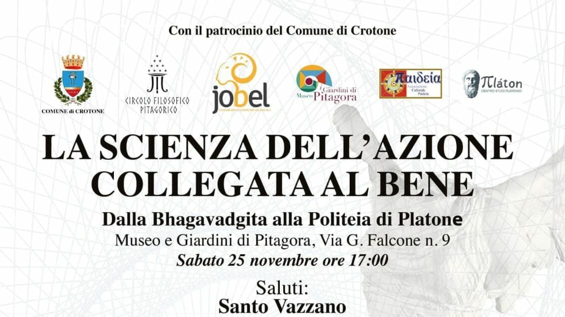 Sabato 25 novembre alle ore 17:00 presso il Museo di Pitagora si terrà il convegno filosofico intitolato “La scienza dell’azione collegata al bene. Dalla Bhagavadgita alla Politeia di Platone”.
