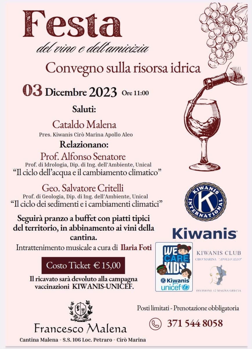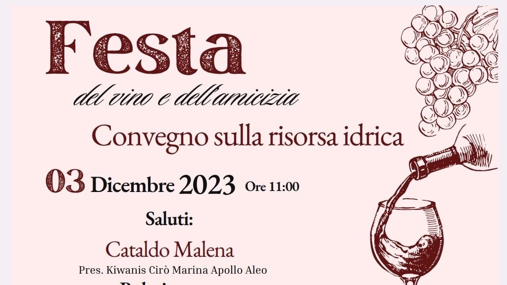 Il 3 dicembre 2023, alle 11:00, presso la suggestiva Cantina Malena di Cirò Marina, si terrà un’indimenticabile “Festa del Vino e dell’Amicizia”. L’evento non si limita alla celebrazione enologica, ma integra un convegno di spessore sulla fondamentale risorsa idrica.