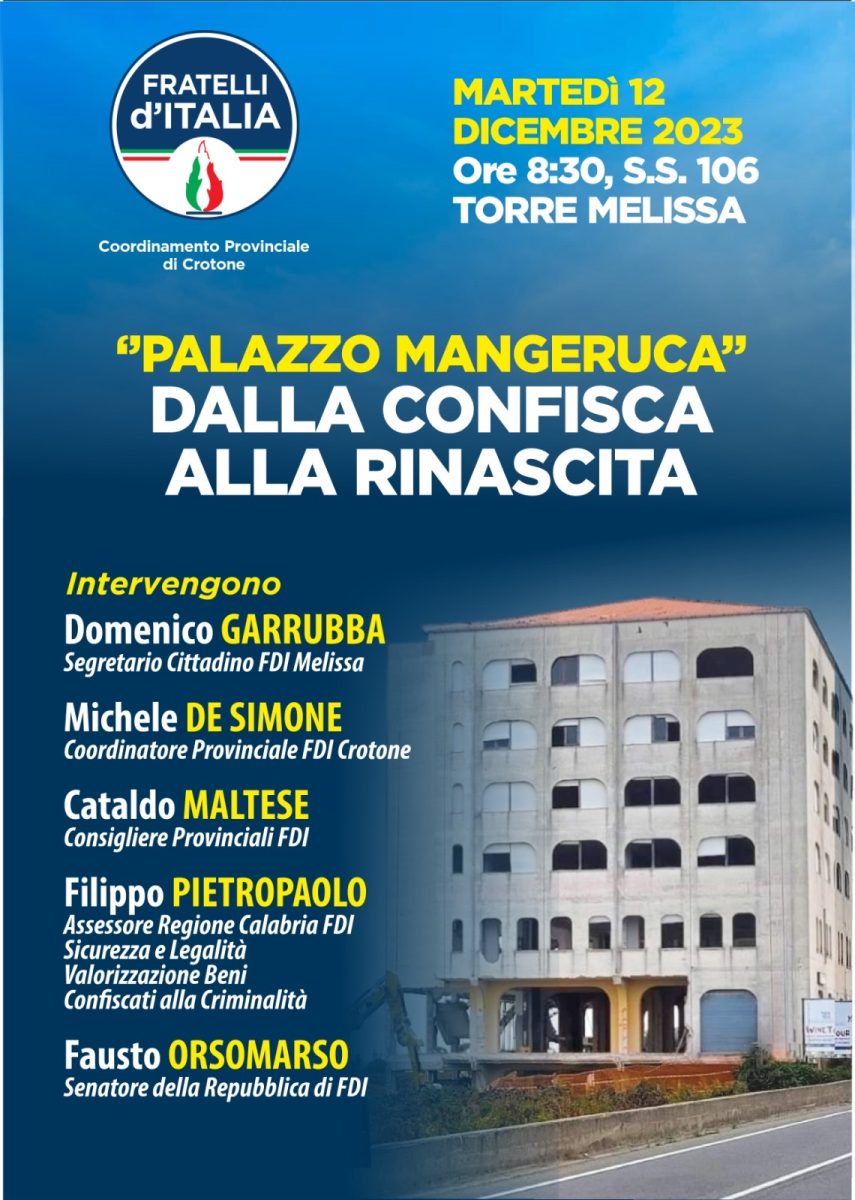 Il coordinamento provinciale di Fratelli d’Italia Crotone ha annunciato un importante evento che si terrà martedì 12 dicembre 2023 alle ore 8:30 presso il “Palazzo Mangeruca” a Torre Melissa, lungo la S.S. 106. L’iniziativa, dal titolo “Palazzo Mangeruca, dalla Confisca alla Rinascita”, mira a focalizzarsi sulla valorizzazione dei beni confiscati alla criminalità.