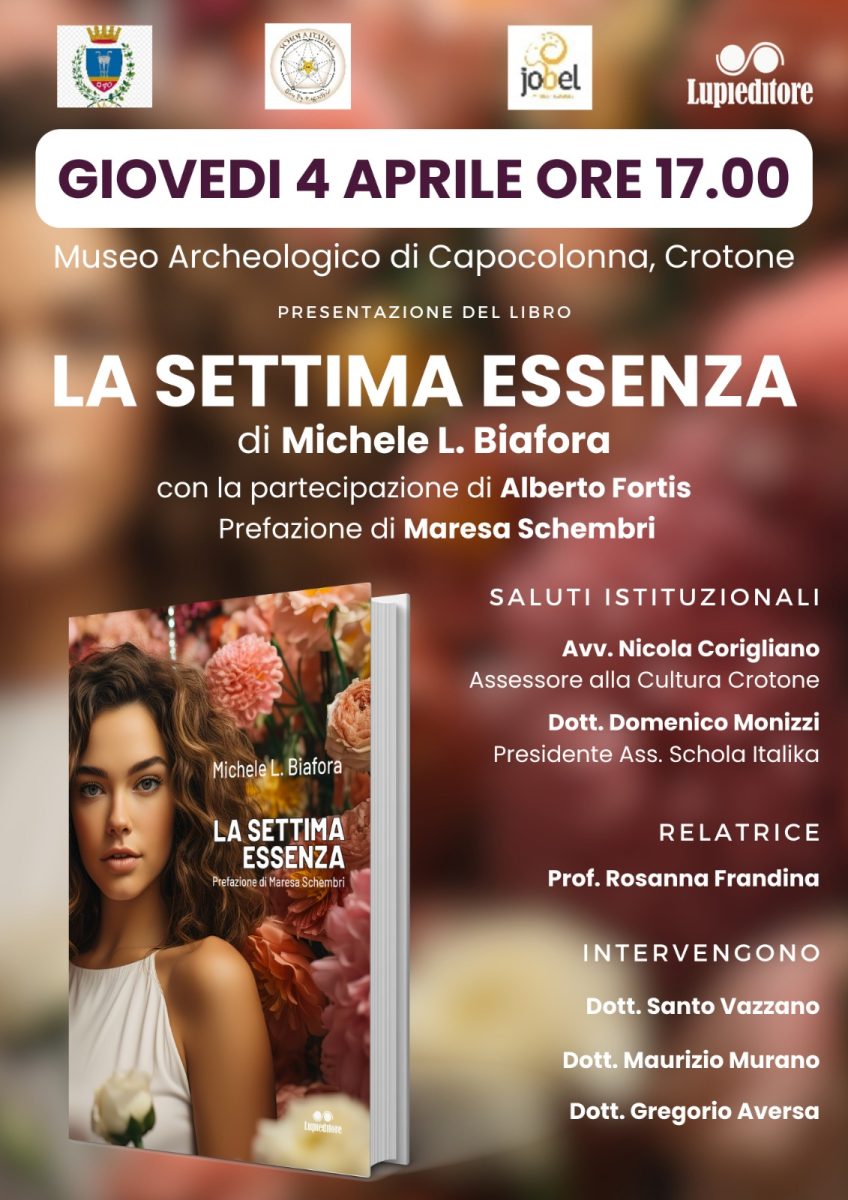 L’evento, introdotto dall’assessore alla cultura Nicola Corigliano e dal presidente dell’associazione Schola Italia, Domenico Monizzi, oltre alla presenza dell’autore, prevede l’intervento di Santo Vazzano, presidente del Consorzio Jobel, Maurizio Murano, coordinatore della Nuova Scuola Pitagorica, e Gregorio Aversa, direttore del Museo Archeologico di Crotone e di Capo Colonna, moderati dalla docente Rosanna Frandina.