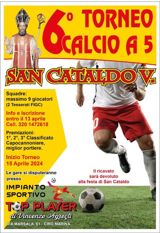 Ritorna il torneo di calcio a 5 che si organizza in occasione dell’approssimarsi delle manifestazioni dedicate al Santo Patrono della città “S.Cataldo”, che si celebrano ogni anno nelle giornate precedenti 10 maggio. Partirà infatti martedì, 16 aprile il torneo che vedrà impegnate 12 squadre, suddivise in 3 gironi, Accederanno alla fase successiva le prime due di ogni girone più le due migliori terze. Dopo il sorteggio e la composizione di due gironi si procederà quindi con i quarti di finale, semifinali e finale. Saranno premiate le prime tre classificate, Il miglior giocatore e il miglior portiere del torneo. Il torneo organizzato da Vincenzo Agresti in collaborazione con Michele Palmieri e il comitato di S.Cataldo, si disputerà presso l’impianto sportivo Top Player e il ricavato sarà devoluto per l’organizzazione delle celebrazioni civili predisposte per il Santo Patrono. Un torneo che si annuncia molto partecipato e che sperano gli organizzatori, sarà svolto in un clima gioioso e festoso in piena amicizia e condivisione.