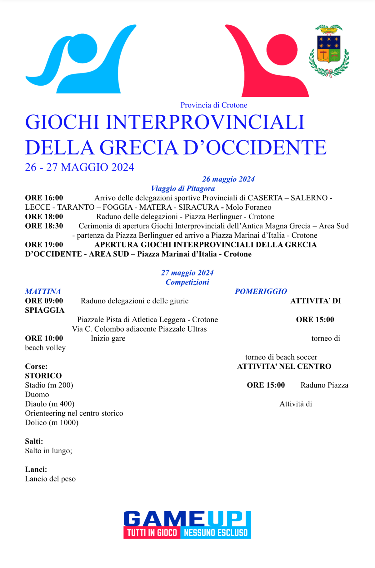 IL PROGRAMMA DELL’EVENTO: All’arrivo della flotta – previsto il 26 maggio alle ore 18.00 – vi sarà l’apertura dei Giochi Interprovinciali della Grecia d’Occidente, alla presenza di tutte le autorità civili e militari,sul lungomare di Crotone, con il corteo delle delegazioni in partenza da piazza Berlinguer fino a piazza Marinai d’Italia. E’proprio in piazza Marinai d’Italia che si potrà assistere alla corsa del Tedoforo per l’accensione del fuoco dei Giochi, al ‘giuramento’ dell’atleta e dei giudici di gara ed al successivo momento artistico-musicale. I Giochi avranno inizio il 27 maggio alle ore 09.00 presso la pista di atletica di Crotone, dove si svolgeranno le 5 discipline dell’antica Grecia d’Occidente. A ripercorrere le antiche gesta dei campioni dell’antica Magna Grecia, infatti, saranno i partecipanti ai giochi, che si cimenteranno con la corsa, stadio (200 metri), diaulo (400 metri), dolico (1000 metri) ma anche il salto in lungo e il lancio del peso.