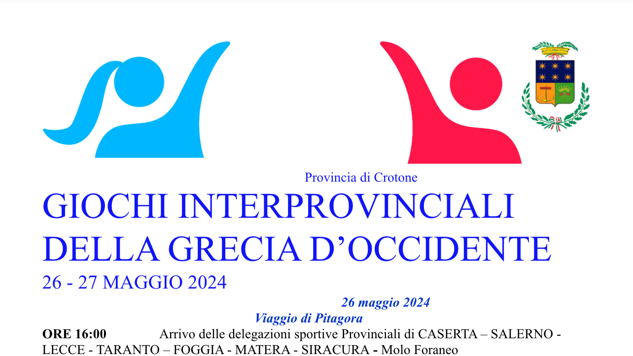 Ad ospitare i Giochi Interprovinciali dell’antica Magna Grecia, quindi, sarà proprio la Provincia di Crotone, individuata per l’area Sud come Ente coordinatore dei giochi previsti per il 27 maggio. Si partirà, però, il 26 maggio con le delegazioni del Sud composte dalle province di Matera, Caserta, Salerno, Lecce, Foggia, Taranto, Siracusa e Crotone che arriveranno nella nostra città facendo una traversata in barca a vela, partendo da Policoro, sulle orme del famoso ‘viaggio di Pitagora’.