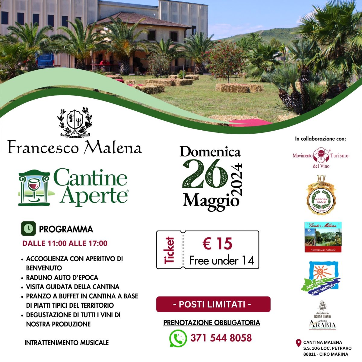 L’evento tanto atteso dagli amanti del vino e della cultura enologica è finalmente alle porte! Domenica 26 maggio 2024, Cantina Malena aprirà le sue porte per una giornata all’insegna del gusto, della tradizione e del divertimento. Situata a Cirò Marina, sulla S.S. 106 in località Petraro, Cantina Malena è pronta ad accogliere tutti i visitatori con un programma ricco e variegato che si svolgerà dalle 11:00 alle 17:00.