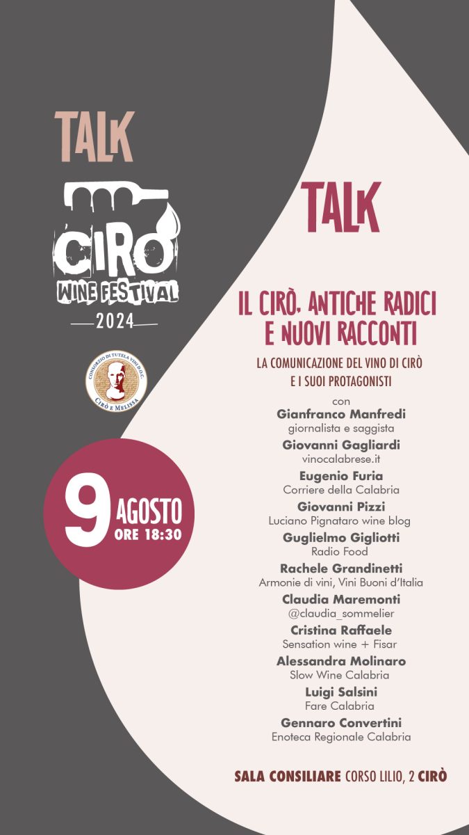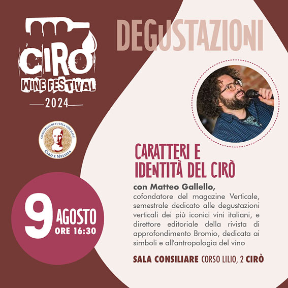 Il 9 agosto Cirò accoglie la masterclass con il cofondatore del magazine Verticale e il confronto tra la stampa enogastronomica e i wine influencer calabresiUna tradizione vinicola secolare, come quella di Cirò, si mostra nei giorni del Cirò Wine Festival nella sua multiformità. Il territorio e le storiche famiglie di produttori, accanto ai giovani vignaioli che hanno riscoperto la forza e la bellezza della viticoltura che qui si pratica da generazioni, la tutela della biodiversità e il carattere autentico di una identità che qui si intreccia con la storia del vino italiano. L’evento del “Consorzio di tutela e valorizzazione dei vini Cirò Doc e Melissa Doc” che è nel pieno della programmazione di eventi collaterali proposti dalle e nelle cantine, si appresta ad entrare nel vivo con la degustazione di giorno 9 agosto a cura di Matteo Gallello – cofondatore del magazine Verticale, semestrale dedicato alle degustazioni verticali dei più iconici vini italiani, e direttore editoriale della rivista di approfondimento Bromio, dedicata ai simboli e all’antropologia del vino – con inizio alle ore 16:30 presso la sala consiliare del comune di Cirò. Qui il link per la prenotazione https://www.eventbrite.it/e/biglietti-degustazione-caratteri-e-identita-del-ciro-966360599567?aff=ebdssbdestsearchUn momento per approfondire – attraverso l’assaggio di sei vini degustati alla cieca (due bianchi, due rosati e due rossi) – il carattere e l’identità del territori del vino calabrese tra i più straordinari per esperienze produttive, storicità e narrazioni che confluiscono nella Doc istituita oltre mezzo secolo fa per valorizzare una tradizione enologica che ha radici profonde con il territorio.