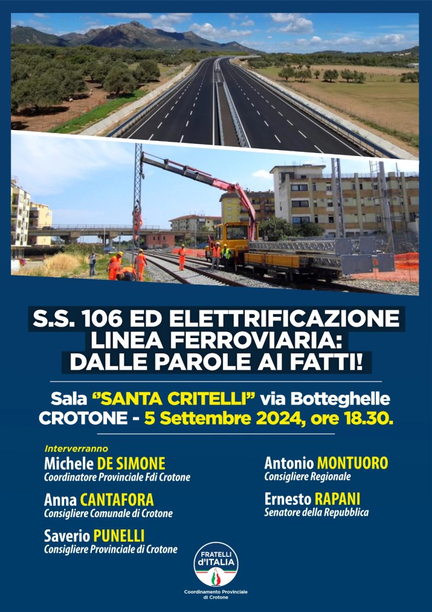 Crotone, 3 settembre 2024 – Il prossimo giovedì 5 settembre, alle ore 18,30, presso la sede “Santa Critelli” di Via Botteghelle a Crotone, si terrà un importante incontro organizzato dalla segreteria provinciale di Fratelli d’Italia (FdI) per discutere della rete infrastrutturale lungo la tratta jonica: la Strada Statale 106 e l’elettrificazione della linea ferroviaria. L’evento, dal titolo “SS.106 ed elettrificazione linea ferroviaria: dalle parole ai fatti!”, vedrà la partecipazione di figure politiche di rilievo, tra cui il senatore Ernesto Rapani. L’incontro rappresenta un momento significativo per fare il punto della situazione sui progetti in corso, con particolare riferimento ai lavori sulla SS.106, una delle arterie più critiche del Sud Italia, spesso al centro di discussioni per la sua pericolosità e per i ritardi nei lavori di ammodernamento. Parallelamente, verranno illustrati i piani per l’elettrificazione della linea ferroviaria jonica, un intervento atteso da anni e considerato essenziale per migliorare i collegamenti e ridurre l’isolamento del territorio.