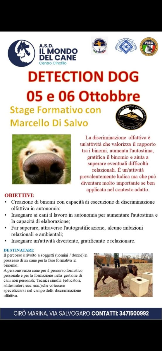 Il centro si distingue per il suo approccio professionale all’educazione cinofila, grazie a un team qualificato e riconosciuto a livello nazionale per l’addestramento dei cani. A conferma del loro impegno nella formazione, il 5 e 6 ottobre 2024, dalle ore 09:00 alle ore 18:00, l’A.S.D. Il Mondo del Cane organizza uno stage formativo sulla discriminazione olfattiva. L’evento si terrà presso il campo cinofilo situato in via Salvogaro, Cirò Marina, e sarà condotto dal Dott. Marcello Di Salvo, esperto in Scienze della Formazione Cinotecnica e direttore della MSD Nose Dog Academy.