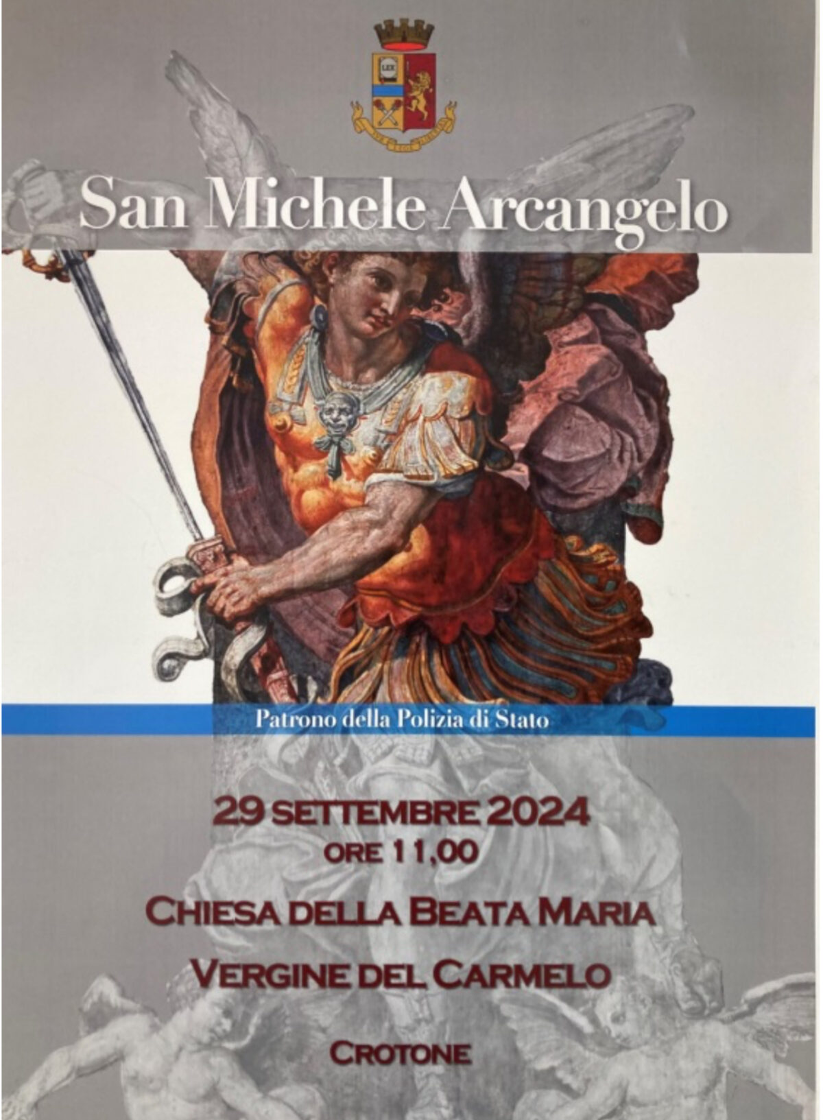 In occasione della festività di San Michele Arcangelo, Patrono della Polizia di Stato, domenica 29 settembre 2024, alle ore 11.00, sarà celebrata una Santa Messa presso la Chiesa della Beata Maria Vergine del Carmelo di Crotone, alla quale parteciperanno le autorità civili e militari, oltre al personale e quanti interessati.