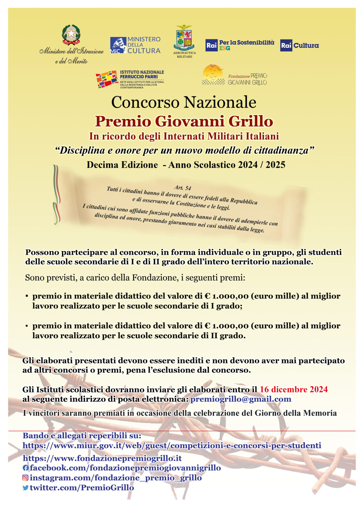 È stato pubblicato in questi giorni sui sito del Ministero dell’Istruzione e del Merito e di Rai Scuola il bando di concorso della decima edizione del Premio Nazionale Giovanni Grillo, dedicato alle migliaia di Internati Militari Italiani della Seconda Guerra Mondiale, dal titolo: “Disciplina e onore per un nuovo modello di cittadinanza”.