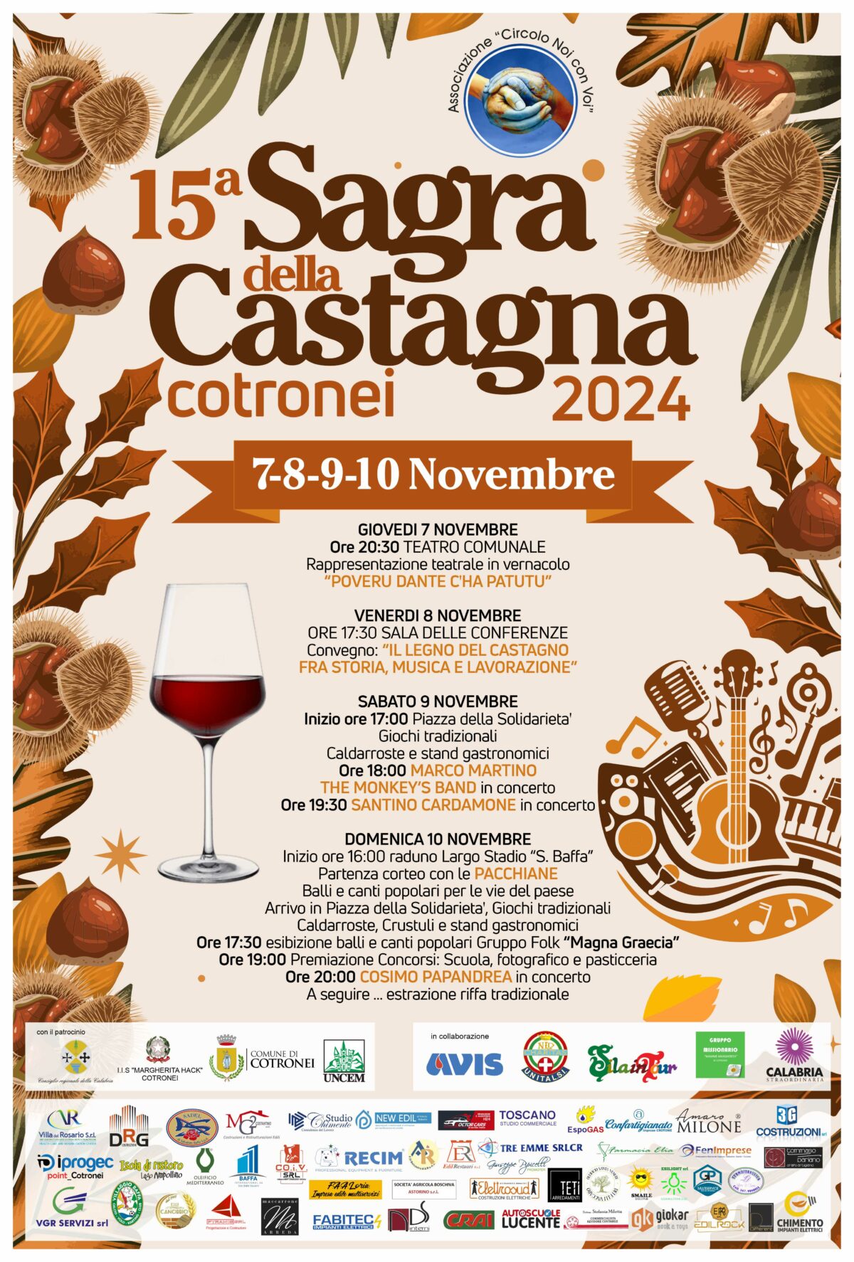 Tutto pronto per la 15^ edizione della “Sagra della Castagna” di Cotronei. L’evento organizzato dall’Associazione Culturale “Circolo Noi con Voi”, nel tempo è cresciuto sempre di più diventando l’appuntamento autunnale più atteso.