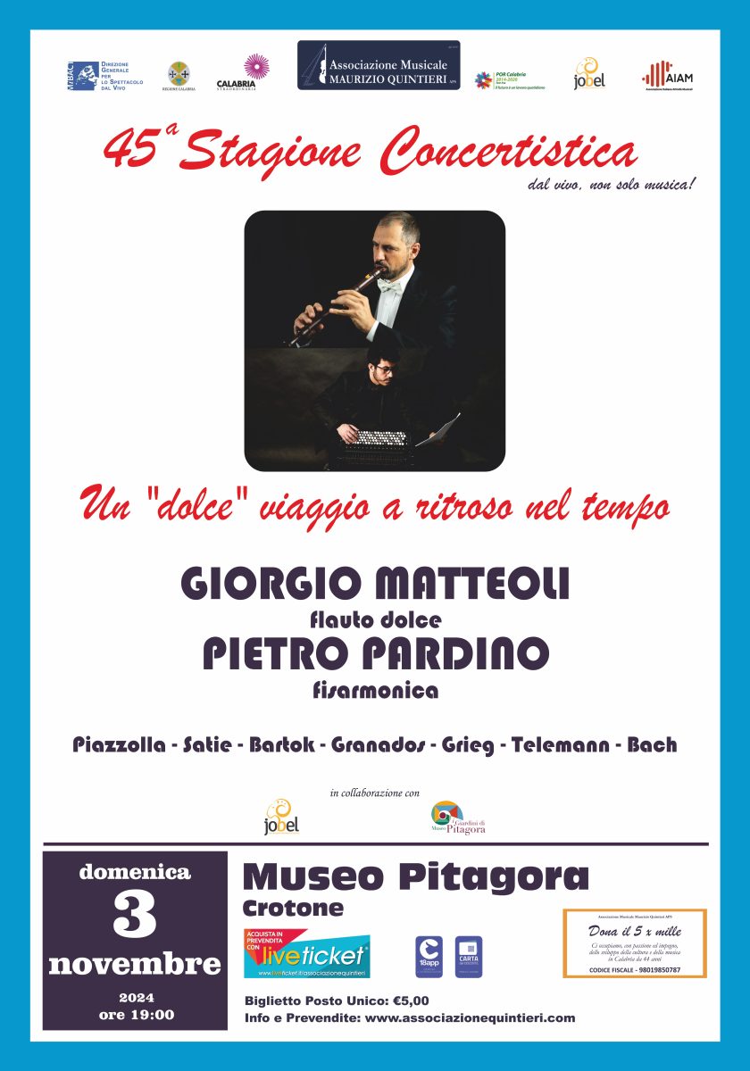 Il concerto Un “dolce” viaggio a ritroso nel tempo, che si terrà presso il Museo di Pitagora, prevede un itinerario musicale attraverso i secoli, con brani che spaziano dal repertorio barocco a quello contemporaneo. Il Duo composto da Giorgio Matteoli, esperto di musica antica, e dal fisarmonicista Pietro Pardini, eseguirà brani di autori come Bach e Telemann, toccando le atmosfere suggestive della musica di Astor Piazzolla e di altri celebri compositori quali E. Satie, B. Bartok, E. Granados.