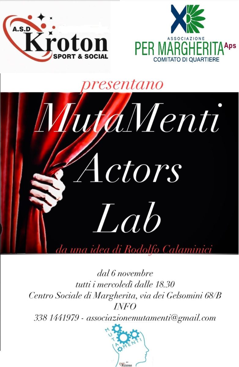 Al via dal 6 novembre “MutaMenti actors Lab”, progetto promosso da Kroton sport & social in collaborazione con associazione Per Margherita Aps, da un’idea di Rodolfo Calaminici. Con questa iniziativa, il teatro approda in periferia con un percorso che punta a coinvolgere attivamente i residenti di alcune contrade della città e non solo.