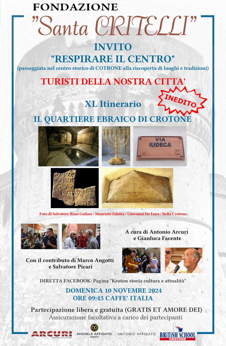 L’evento raggiunge un’importante tappa con il XL Itinerario, dedicato al tema “Il Quartiere Ebraico di Crotone”. Si tratta di un percorso inedito che porterà i partecipanti a esplorare una parte spesso poco conosciuta ma ricca di storia della città: il quartiere ebraico, un tempo luogo di vita e cultura per la comunità ebraica crotonese.