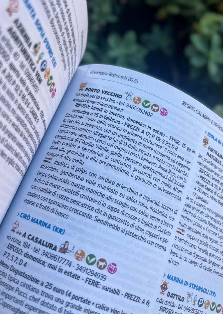 Spunto inserito nella guida: Anna Riga, con la consulenza di Claudio Villella, guida con passione i percorsi gastronomici del nostro locale, proponendo piatti creativi e territoriali al contempo, preparati con attenzione alla genuinità degli ingredienti e una cura speciale per la presentazione. Questo riconoscimento celebra la capacità del Ristorante Porto Vecchio di coniugare creatività e rispetto delle tradizioni locali, un prestigio che ci spinge a continuare a innovare, sempre con uno sguardo attento alla genuinità e alla presentazione.