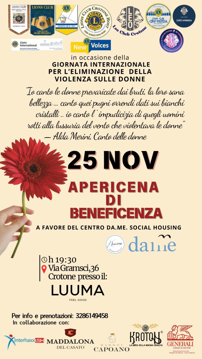 In occasione della Giornata Internazionale per l’eliminazione della violenza contro le donne, i Lions Club della Zona 23, della X Circoscrizione del Distretto 108YA: Crotone Host, Cirò Krimisa, Cropani – Botricello – Sellia Marina MJ, Crotone Marchesato e Crotone Hera Lacinia, aderendo alla proposta della Responsabile Distrettuale New Voices, Maria Bitonte, organizzano un Apericena di beneficenza a favore del Centro DA. ME. SOCIAL HOUSING.