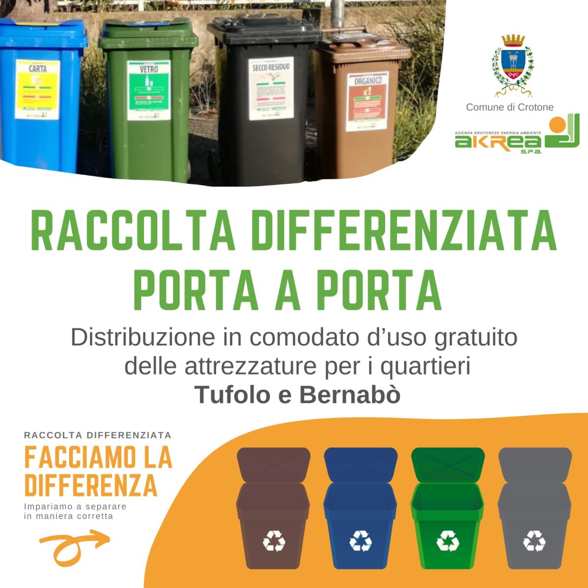 A partire dal 2 dicembre gli addetti di Akrea provvederanno a distribuire, in comodato d’uso gratuito, i materiali per effettuare il nuovo servizio.