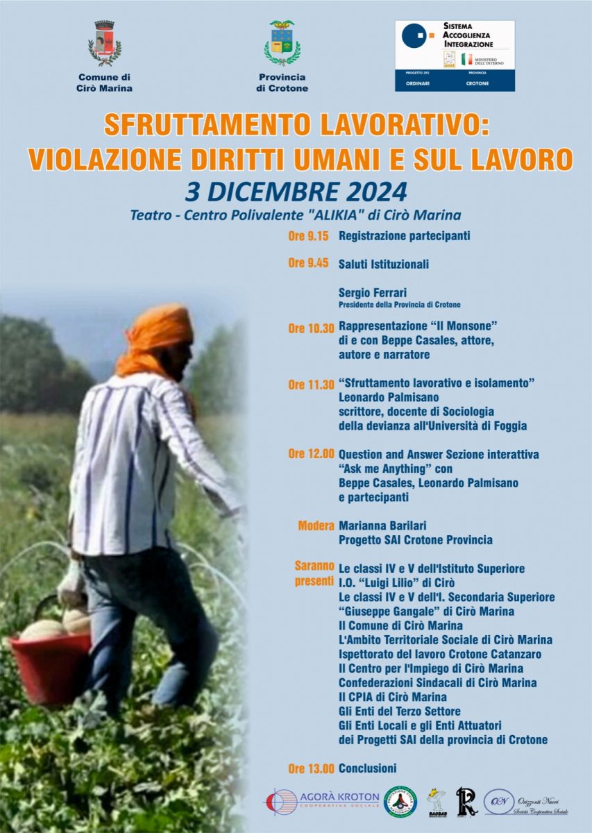 Il 3 dicembre 2024, presso il Teatro – Centro Polivalente “ALIKIA” di Cirò Marina, si terrà un importante incontro dedicato al tema dello sfruttamento lavorativo e delle violazioni dei diritti umani e sul lavoro. L’evento, promosso dalla Provincia di Crotone, dal Comune di Cirò Marina e dal Sistema di Accoglienza e Integrazione, vedrà la partecipazione di esperti, istituzioni locali e giovani studenti.