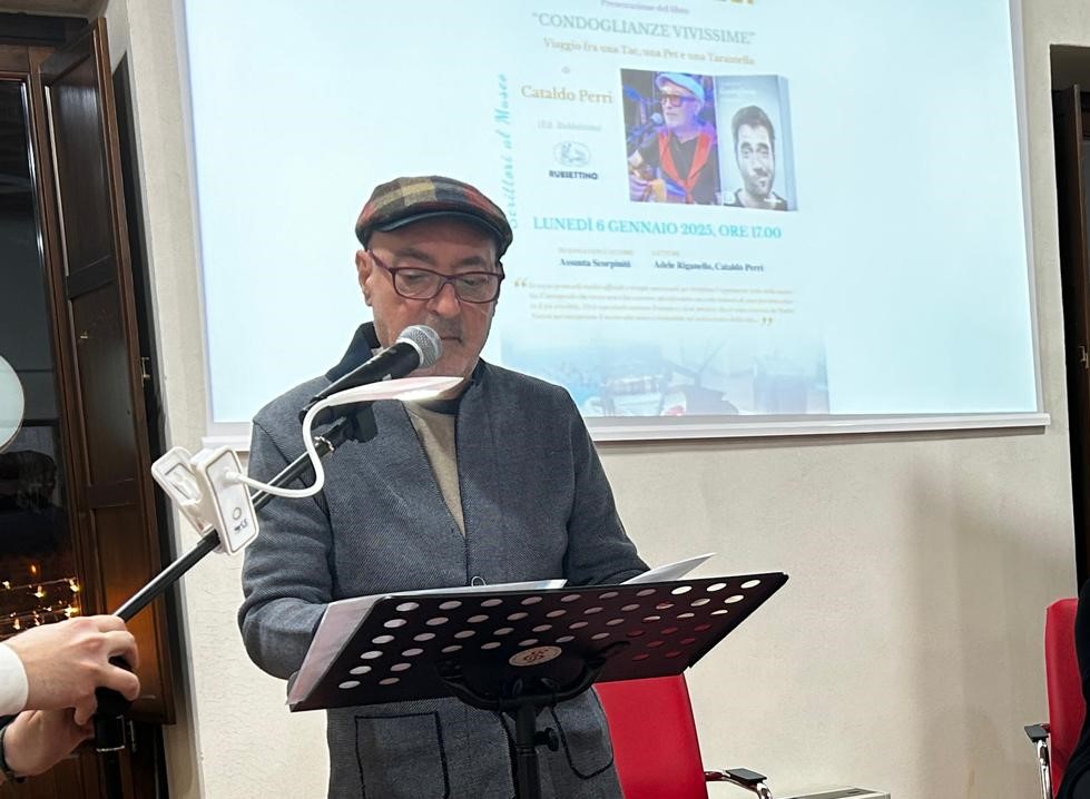 Nel dialogo con la Direttrice del Museo e curatrice della rassegna Assunta Scorpiniti, Perri ha ripercorso molti tratti della sua esperienza artistica, professionale e di vita attraverso le storie che, con trasporto, ha raccontato al pubblico, presenti nel libro, e popolate da personaggi singolari, tra cui quelli incontrati nel day hospital oncologico di Crotone, durante le terapie. Per loro, Cataldo Perri è stato il dottore divenuto paziente che sapeva “cuntare e cantare”, alleviando le sofferenze e le paure, e rispondendo al grande bisogno di speranza, un tema che, insieme all’ironia, è centrale nel libro.