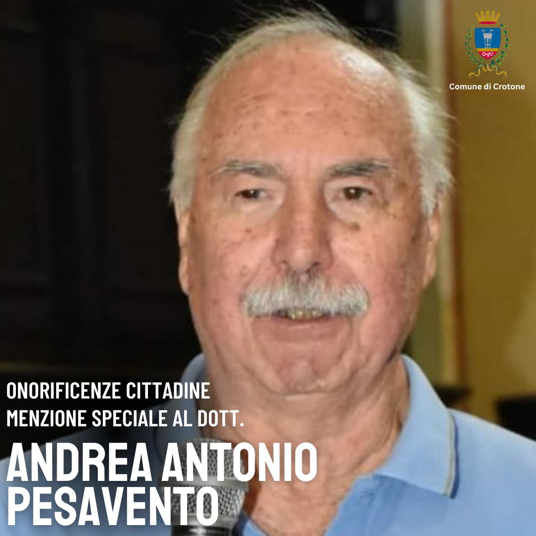 Il Comune di Crotone conferirà la “Menzione Speciale”, prevista dal Regolamento comunale per la concessione della cittadinanza onoraria e delle civiche benemerenze al dott. Andrea Antonio Pesavento.