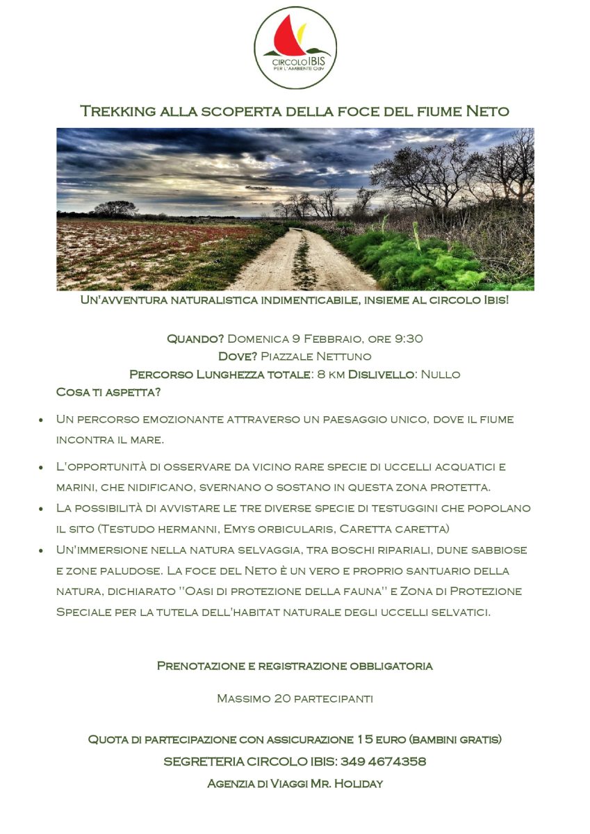 Il circolo Ibis organizza un trekking alla scoperta della foce del fiume Neto, un vero e proprio santuario della natura, dichiarato “oasi di protezione della fauna” e zona di protezione speciale per la tutela dell’habitat naturale degli uccelli selvatici.