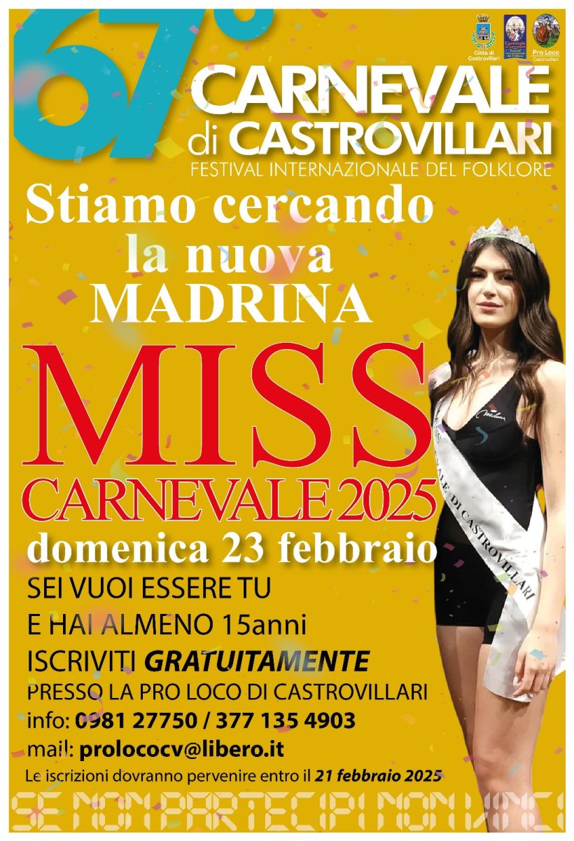 Se sogni di essere la protagonista di questa edizione e hai almeno 15 anni, questa è la tua occasione! La partecipazione è completamente gratuita e aperta a tutte coloro che desiderano vivere un’esperienza unica, immersa nei colori e nell’energia del Carnevale. Per iscriverti, basterà recarsi presso la Pro Loco di Castrovillari, dove sarà possibile compilare il modulo di candidatura e ricevere tutte le informazioni necessarie. (0981-27750 – 3771354903– e-mail prolococv@libero.it )