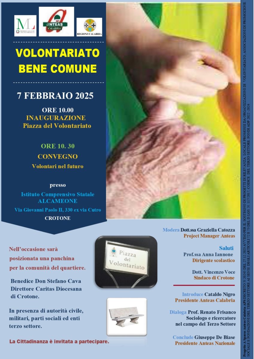 Si terrà a Crotone il 7 febbraio alle ore 10.00 la manifestazione che celebra il VOLONTARIATO BENE COMUNE, l’Anteas Calabria APS intitolerà la Piazza nei pressi dell’IC Alcameone in via Giovanni Paolo II,330, per l’occasione sarà posizionata una panchina per supportare la socializzazione intergenerazionale della comunità del quartiere. Benedice Don Stefano Cava Direttore Caritas Diocesana di Crotone, in presenza di autorità civili, militari, parti sociali ed enti pubblici.