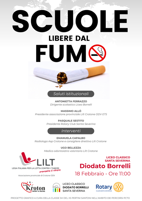 Antonietta Ferrazzo, Ds liceo Borrelli, Massimo Allò, presidente associazione provinciale Lilt Crotone, Pasquale Sestito, presidente Rotary Santa Severina. Durante la mattinata interverranno, inoltre, Emanuela Capalbo, radiologa Asp Crotone e consigliere direttivo Lilt Crotone, Ugo Bellezza, medico odontoiatra e volontario Lilt Crotone.