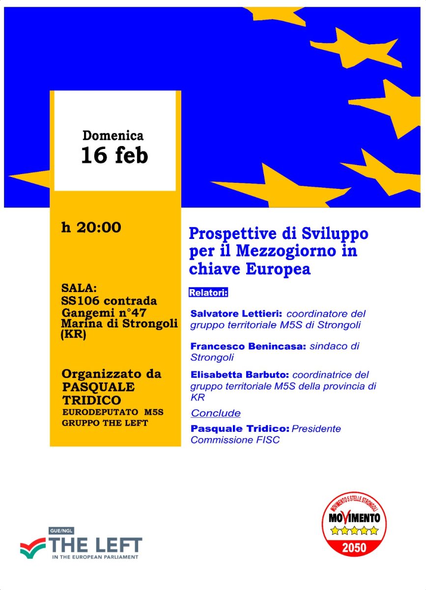 Domenica 16 febbraio, alle ore 20:00, si terrà a Marina di Strongoli (KR), presso la SS106 contrada Gangemi n°47, l’evento intitolato “Prospettive di Sviluppo per il Mezzogiorno in chiave Europea”. L’incontro, promosso dal deputato europeo Pasquale Tridico (M5S – gruppo The Left), rappresenta un’importante occasione di confronto sulle opportunità e le sfide per il Sud Italia nel contesto europeo.