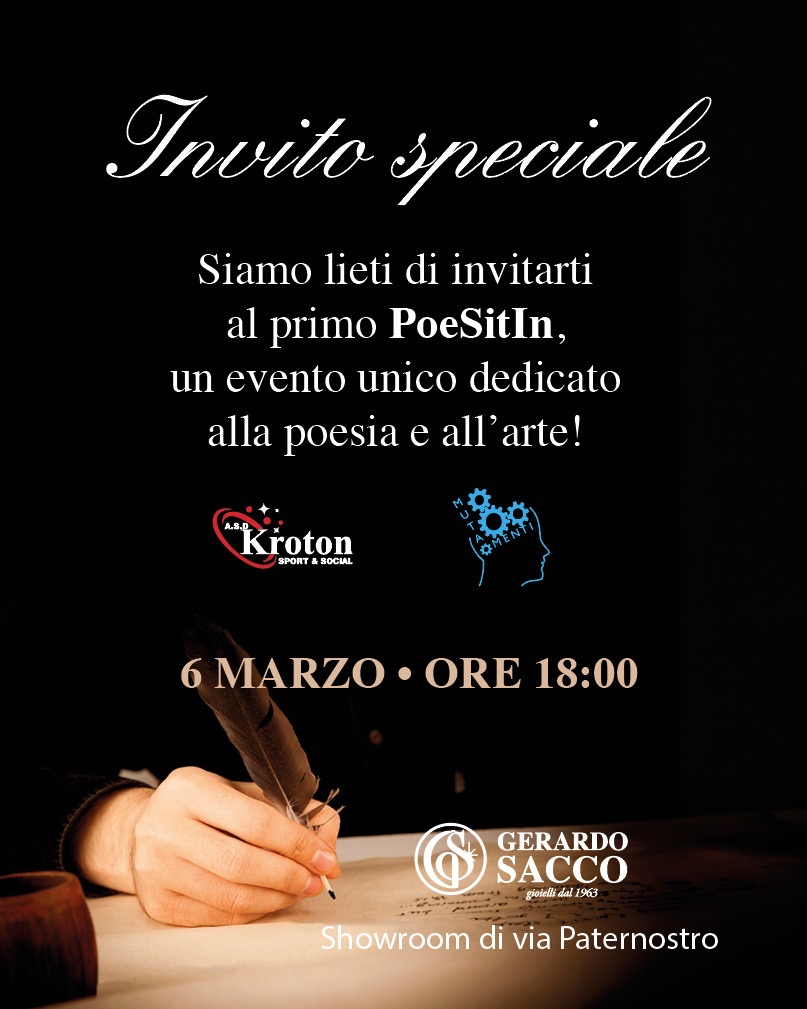 Il primo appuntamento si terrà il prossimo 6 marzo, alle ore 18, presso lo showroom di Gerardo Sacco, brand di respiro internazionale, con un forte marchio identitario del territorio. Tra i gioielli del maestro Sacco si terrà il reading “Movimento poetico”, a cura di Kroma, Accademia di teatro, cinema e musica.