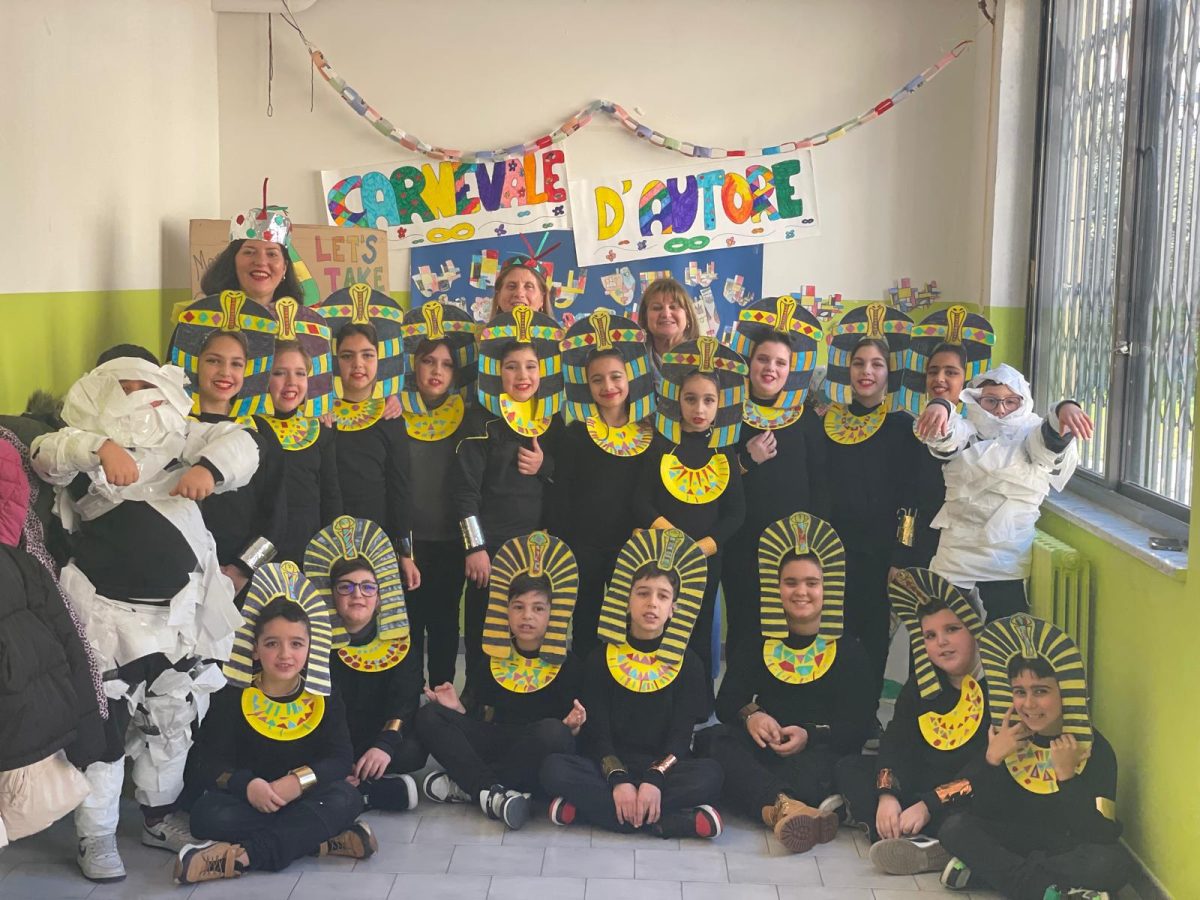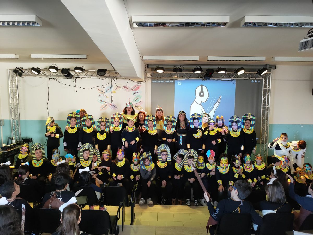 Le classi quarte, invece, si sono trasformate in faraoni e regine dell’Antico Egitto, con tanto di corone dorate, abiti eleganti e trucco scenico. Cleopatra, la regina per eccellenza, ha dato vita a un’atmosfera di regalità e mistero, mentre i faraoni e le loro corti hanno raccontato storie di piramidi e divinità. I bambini, immersi nei ruoli storici, hanno imparato a conoscere le meraviglie dell’antica civiltà egizia, ricreando scene suggestive e suggestioni legate a un passato ricco di fascino e mistero.
