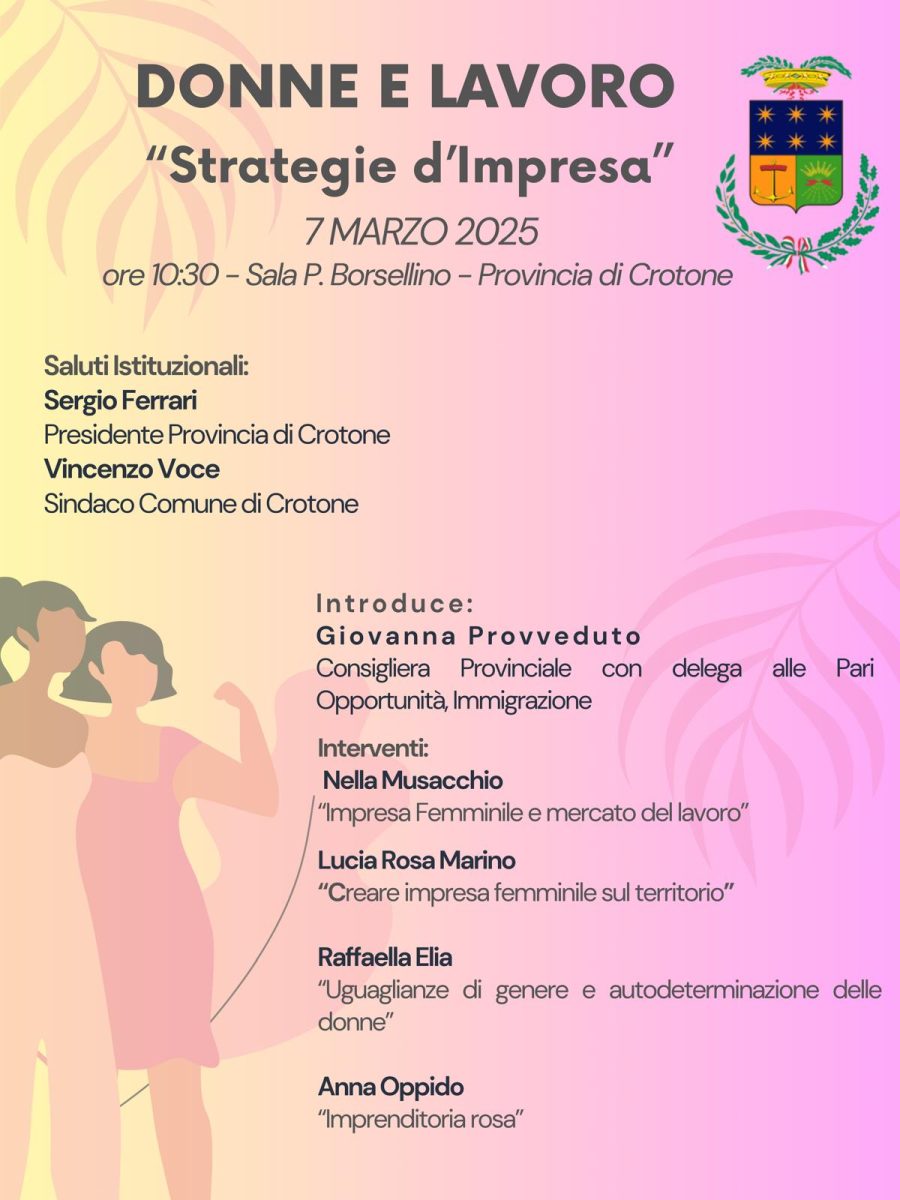 Il 7 marzo alle ore 10,30, presso la sala ‘Paolo Borsellino’ della Provincia di Crotone, si terrà il convegno dal titolo ‘Donne e lavoro – strategie d’impresa’.