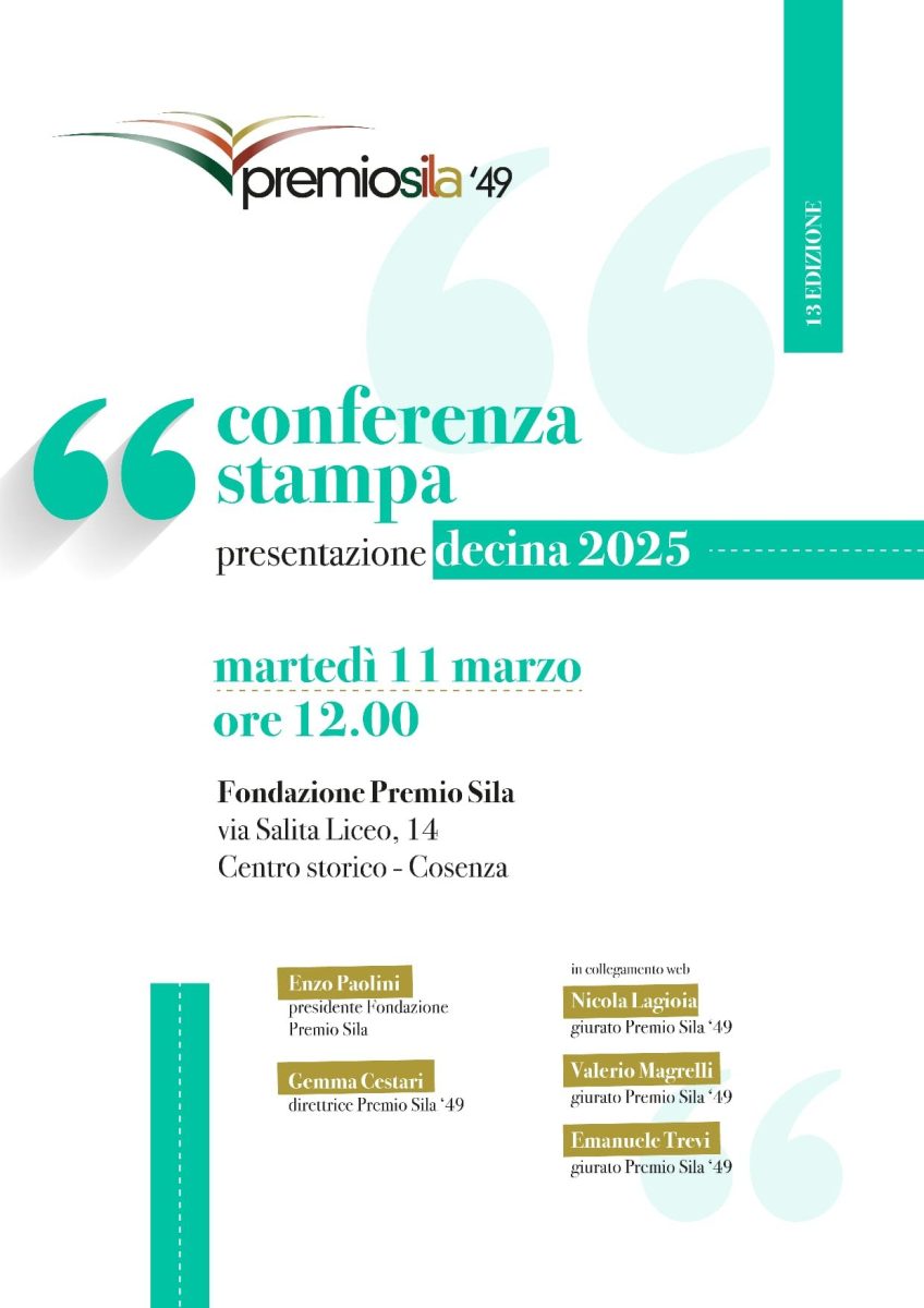 Si apre un nuovo capitolo. Martedì 11 marzo, alle 12, nella sede cosentina della Fondazione Premio Sila, in via Salita Liceo, è in programma l’attesissima conferenza stampa che annuncia la Decina 2025 ovvero i dieci libri che si contendono la tredicesima edizione del prestigioso riconoscimento letterario. Alla conferenza, partecipano il presidente della Fondazione, l’avvocato Enzo Paolini, la direttrice del Premio, Gemma Cestari, e i giurati Valerio Magrelli, Emanuele Trevi e Nicola Lagioia