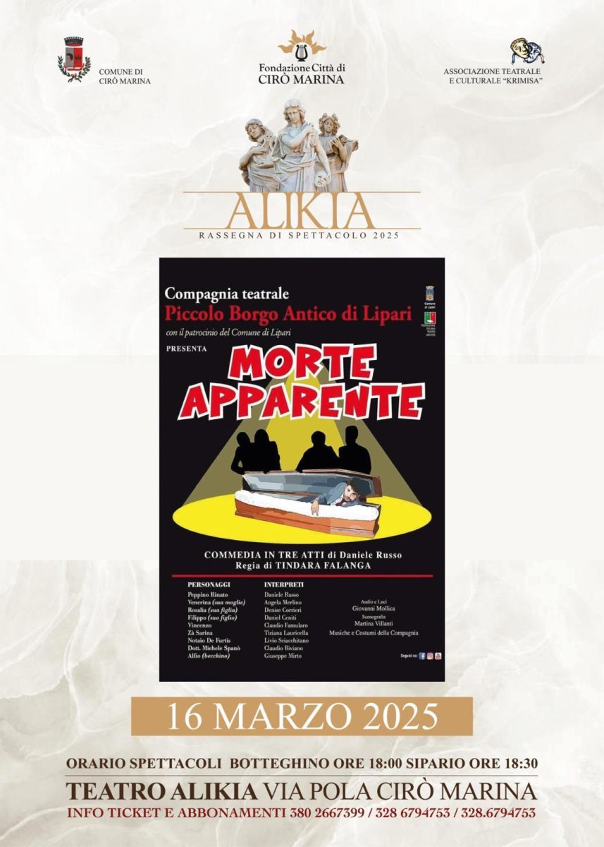 Con “Morte apparente”, il Teatro Alikia conferma la sua vocazione nel portare a Cirò Marina spettacoli di qualità, capaci di far riflettere e divertire allo stesso tempo. Un’occasione speciale per passare una serata in compagnia del buon teatro e lasciarsi coinvolgere da una storia ironica ma profonda, che tocca tematiche universali con leggerezza e intelligenza.