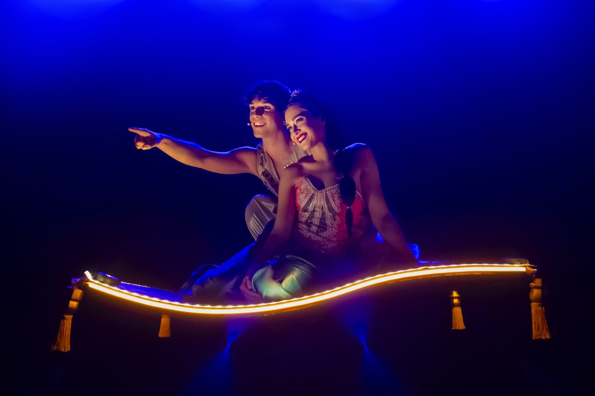 Tra i palazzi e i vicoli dell’antica Bagdad, le vite di due persone molto diverse tra loro sono destinate a intrecciarsi. Da una parte l’unica erede al trono, la giovane e ribelle principessa Jasmine (Angela Ranica), costretta a maritarsi senza amore per dare continuità al Sultanato; dall’altra il giovane Aladin (Eugenio Grandi), astuto ladruncolo dal cuore d’oro e “dall’anima pura”, perennemente braccato dalla legge. Il loro primo incontro è un vero colpo di fulmine. Un idillio però subito spezzato dal malvagio Gran Visir, pronto ad intromettersi ed ingannare entrambi per la sua sete di potere. Sarà il casuale incontro tra Aladin e il Genio della Lampada ad offrire al ragazzo la forza di reagire per tentare di cambiare il suo destino e quello della sua amata.