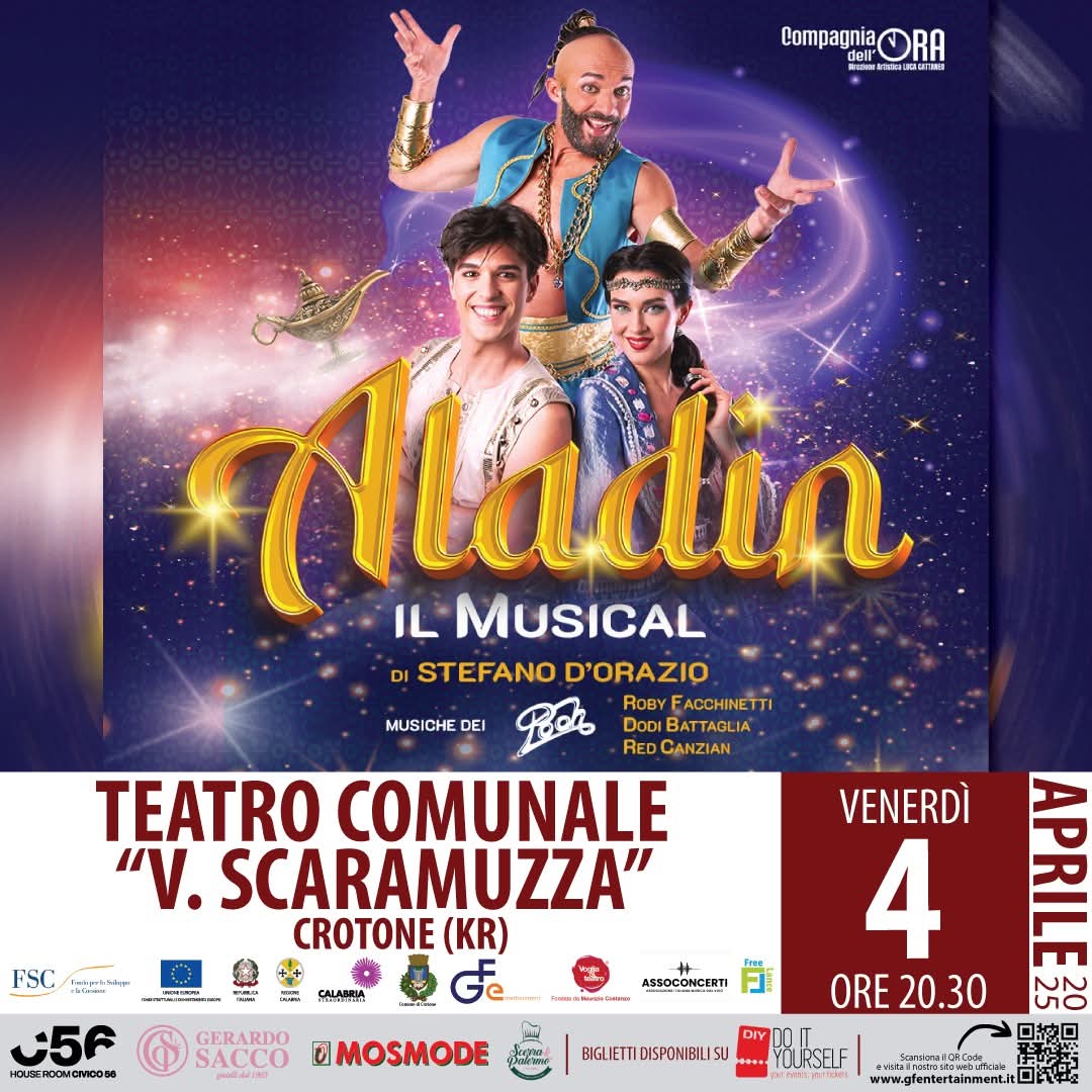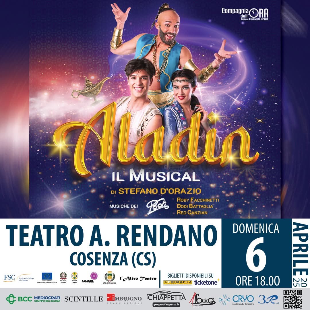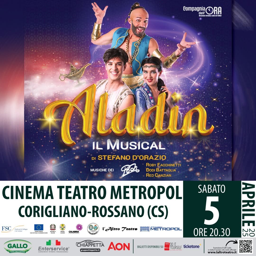 Crotone, Corigliano Rossano e Cosenza sono pronte a volare nelle incantate notti d’oriente. Arriva la magia di “Aladin”, il musical per grandi e piccini, scritto dalla penna di Stefano D’Orario con le musiche di Roby Facchinetti, Dodi Battaglia e Red Canzian. Diciotto musiche originali dei Pooh, la direzione musicale di Enrico Galimberti, le coreografie di Ilenia De Rosa, la regia e direzione artistica di Luca Cattaneo: il musical “Aladin”, prodotto dalla Compagnia dell’Ora, andrà in scena venerdì 4 aprile, ore 20.30, al Teatro comunale Vincenzo Scaramuzza di Crotone, per la Rassegna “Crotone…Voglia di Teatro”; sabato 5 aprile, ore 20.30, al Cinema Teatro Metropol di Corigliano Rossano con la “Rassegna L’Altro Teatro On-Stage Metropol”, inserita nell’ambito della Stagione “Il Teatro si fa in tre” del Comune di Corigliano Rossano; domenica 6 aprile, ore 18.00, al Teatro Alfonso Rendano di Cosenza per la “Rassegna L’Altro Teatro”. Lunedì 7 aprile, ore 9.30, il musical andrà in scena, in esclusiva, al Teatro Rendano per gli studenti delle scuole di ogni ordine e grado.