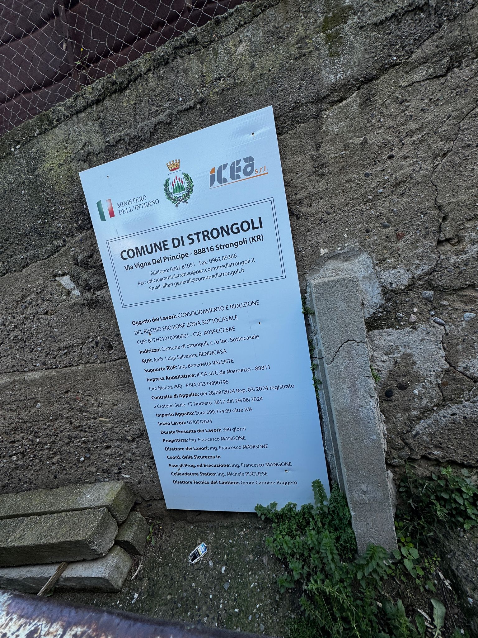 Con la demolizione delle opere si riprenderà a dar seguito al consolidamento ed alla riduzione del rischio erosione di via Sottocasale. L’appalto ed i lavori sono stati aggiudicati dalla ICEA srl di Cirò Marina per un importo di 669.754,09 euro. Progettista del lavoro l’ing. Francesco Mangone.