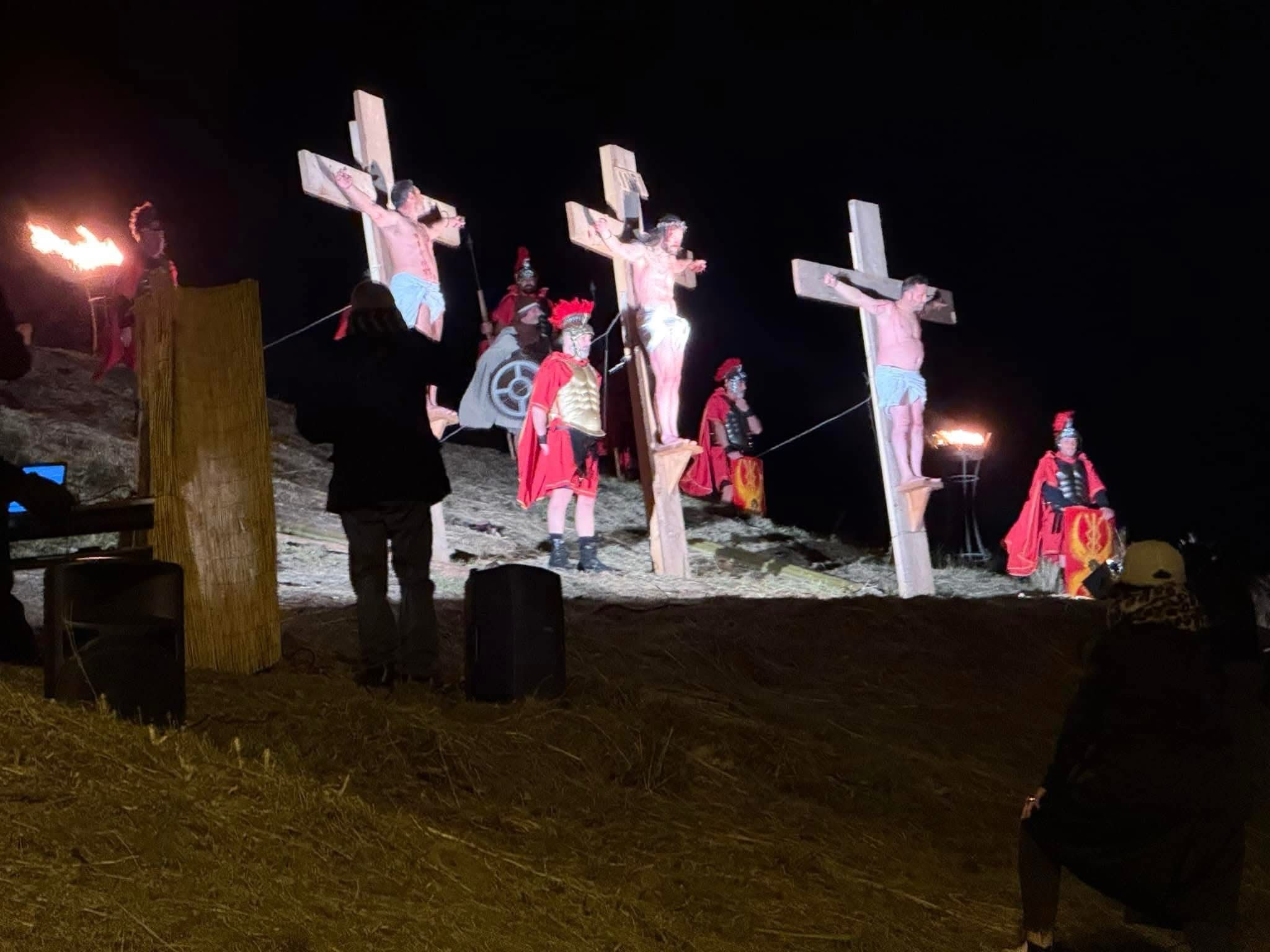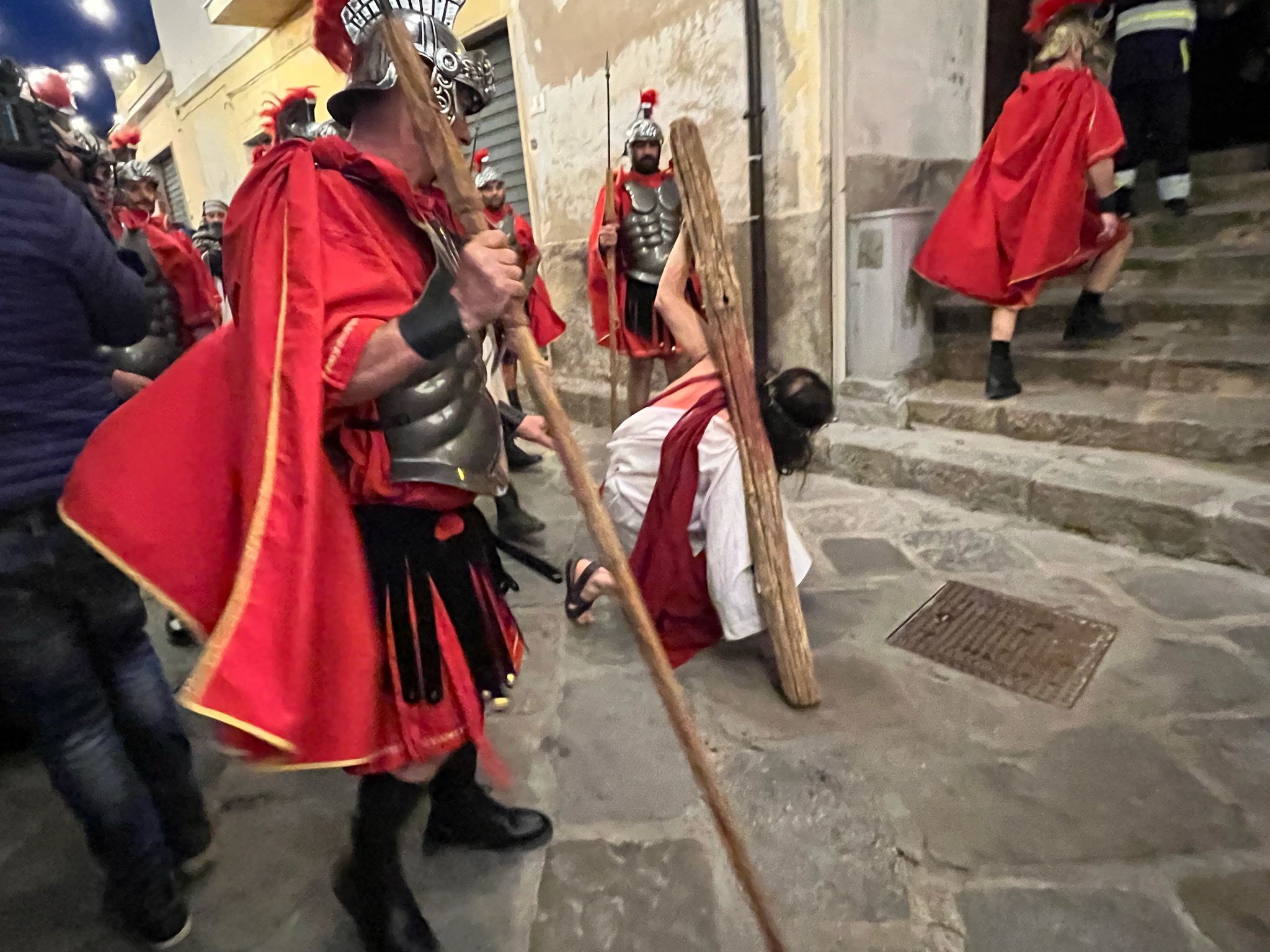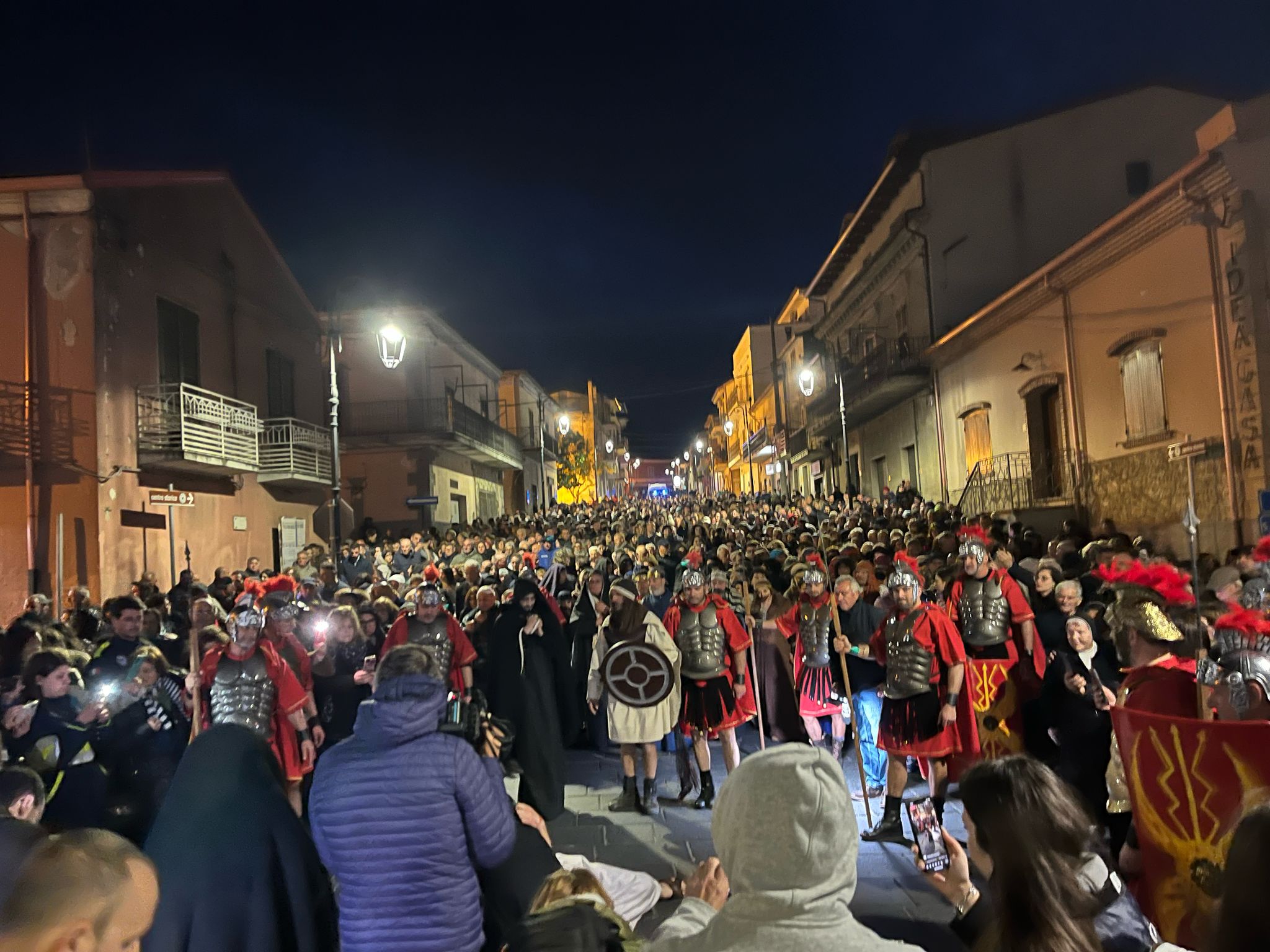 Come per incanto le fiamme hanno continuato a bruciare nei loro bracieri, mentre il pane offerto per il corpo di Cristo ha riunito il quadro dell’ultima cena. Nel Giardino degli ulivi la preghiera è salita al cielo e Gesù si è affidato al Padre con fiducia. Il bacio che l’ha condannato, poi l’arresto, la scelta di liberare Barabba, ed ancora la frusta romana che ha parlato per tutti. Dal Castello dopo aver attraversato l’intero paese si è arrivati alla Vigna del Principe, in altura, che è diventato il palcoscenico per l’intero borgo di Strongoli. La Croce poi ha suggellato l’ultimo respiro di Cristo, la morte con il suo arrivo ha invece segnato poi la vittoria della Vita nel nome dell’amore per il Padre.