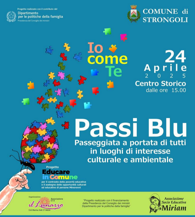 L’Amministrazione di Strongoli e tutta la rete del progetto “Io come Te” organizza “Passi Blu” che vuole essere un momento di festa, incontro e condivisione, ma anche un’occasione preziosa per accendere un faro sulle esigenze concrete di tante famiglie che vivono la realtà dell’autismo ogni giorno.
